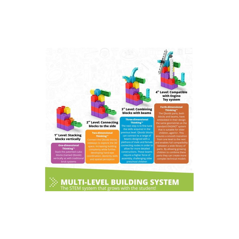 Az Engino kockák életkor szerint 4 alrendszerre vannak felosztva. A Baby Qboidz a biztonságot és a motoros készségek fejlesztését célozza 1,5 éves kortól. A Qboidz 3 éves kortól néhány speciális összekötő elemmel egészül ki, és a kognitív fejlődésre összpontosít. Engino Classic, amelyek az eredeti, eredeti kockák 6 éves kortól a gyermekek számára, lehetővé téve a komplex építést több tengelyen. Engino Mechanics 9 éves kortól, olyan műszaki részekkel, mint a fogaskerekek és a fogaskerekek.