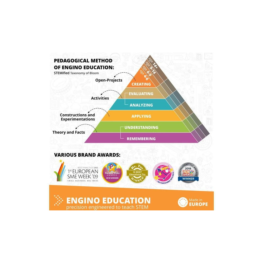 Az Engino már 1,5 éves kortól segíti a gyermekek kritikus gondolkodásának, térbeli képzelőerejének és szem-kéz koordinációjának fejlődését. Megtanítja őket együttműködni, problémamegoldásokat találni és az elméletet a gyakorlatban alkalmazni. A pedagógusok és a szülők számára az Engino egy teljes STEM tanulási rendszert kínál, amely a tudományos alapelvek széles körét lefedi, és elősegíti a játékon keresztül történő tanulást. Az Engino büszke a biztonsági és környezetvédelmi szempontokra.