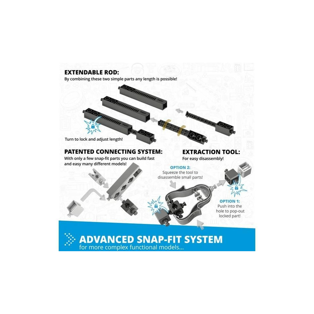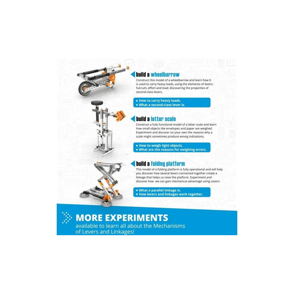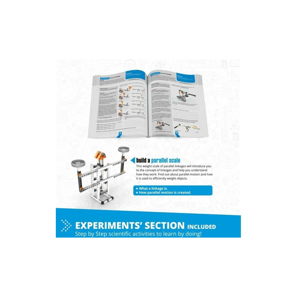 A Stem Mechanics karok és összeköttetések lehetővé teszi, hogy megnézd, hogyan használják a karokat az erő növelésére nehéz tárgyak emelésekor, és hogyan változtathatják meg a mozgás irányát. Fedezd fel, hogyan hozhatsz létre összetett mozgású modelleket sok kar összekapcsolásával, és nézd meg, hogyan alkalmazhatók ezek a kapcsolatok különböző gépeknél. Építs 16 funkcionális modellt, például hintát, mozgó mérleget, kerekeket, parkolókaput, mozgó játékfigurákat, pantográfot és még sok mást. Az összes modell megépítéséhez egyszerű útmutatót találsz az interneten vagy a mellékelt füzetben. A füzet részletes magyarázatot ad az alkalmazott különböző tudományos elvekről, és innovatív kísérleti tevékenységeket tartalmaz a gyakorlati tanuláshoz. Van egy kvíz rész is, ahol tesztelheted az újonnan megszerzett tudásodat!