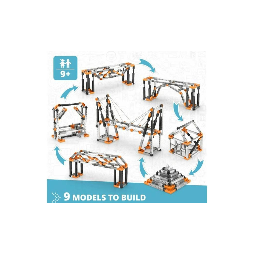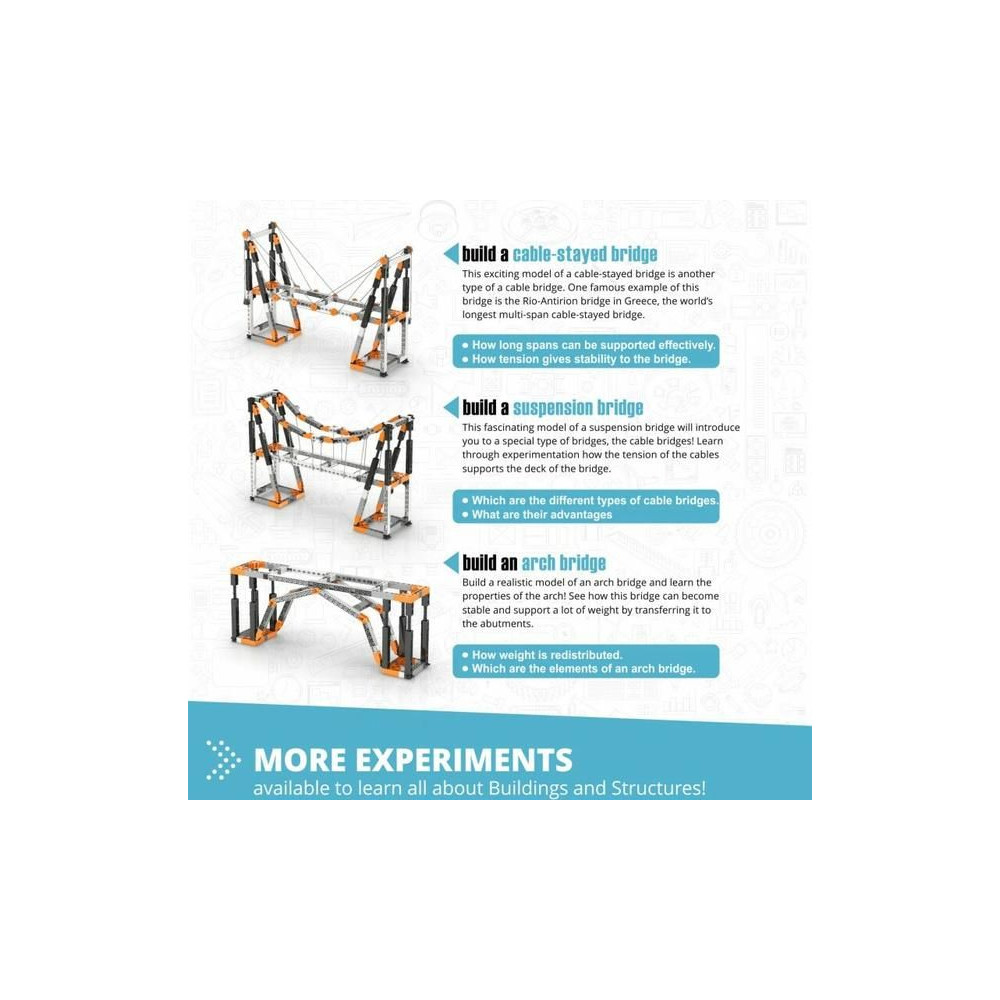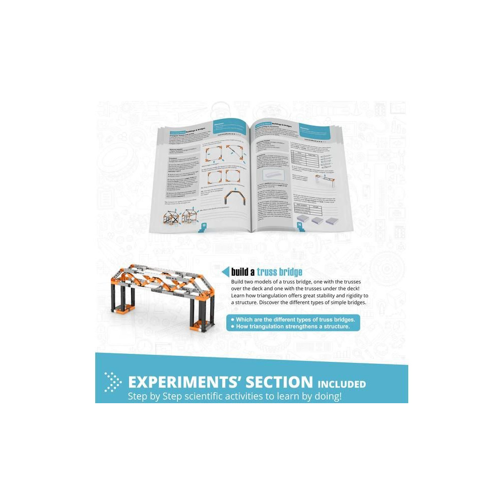 Oktatási szerelőkészlet. Gyermeke 6, a gyártó által tervezett modellt építhet, és korlátlan számú saját modellt találhat ki. Meglátja, hogy egy erős és tartós hidat építeni egyáltalán nem könnyű, és ehhez megfelelő tudásra és tapasztalatra van szükség. Ezeket a készségeket a számodra elkészített hídminták megépítésével szerzed meg, amelyek alapján elkezdheted a saját terveidet. Az összes modell megépítéséhez egyszerű utasításokat találsz az interneten vagy a mellékelt füzetben. A füzet részletes magyarázatot ad az alkalmazott különböző tudományos elvekről, és innovatív kísérleti tevékenységeket tartalmaz a gyakorlati tanuláshoz. Van egy kvíz rész is, ahol tesztelheted újonnan megszerzett tudásodat! Figyelmeztetés: kis szelvények. Ez a termék nem alkalmas 3 éves kor alatt, hacsak nincs másképp feltüntetve.