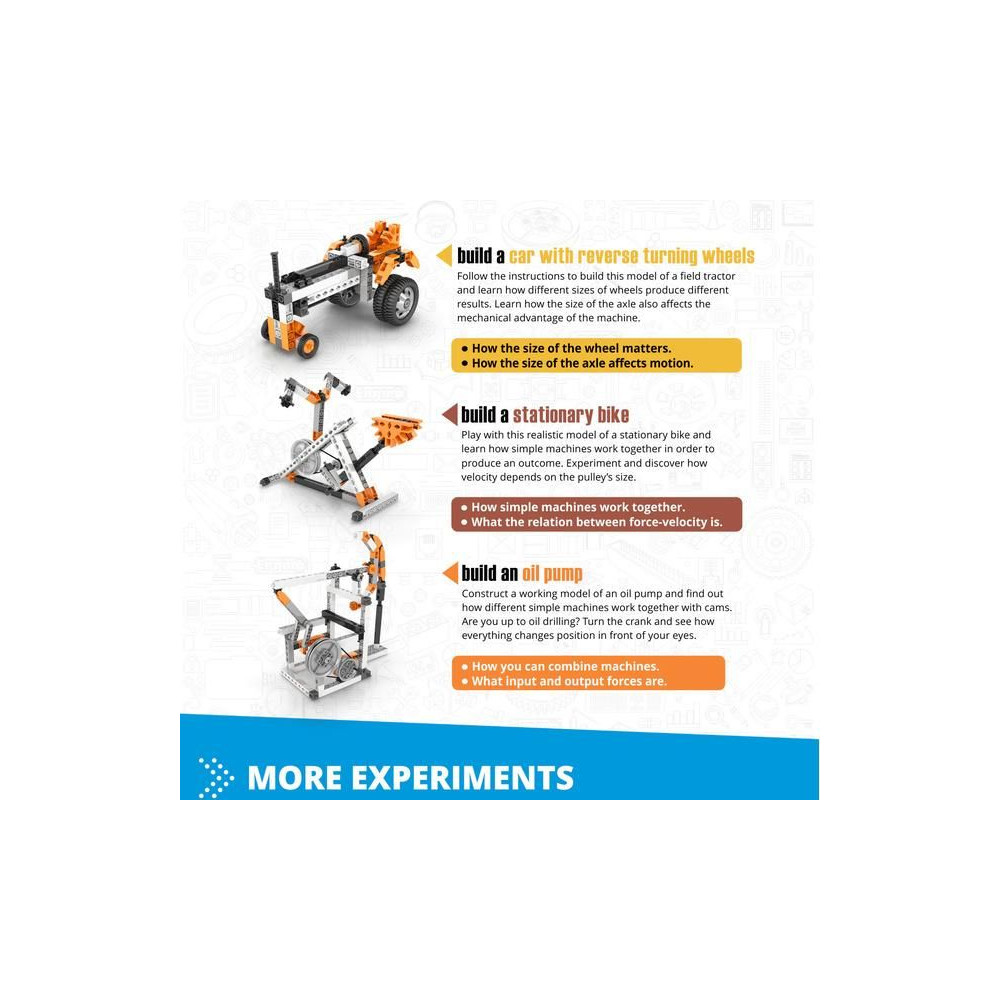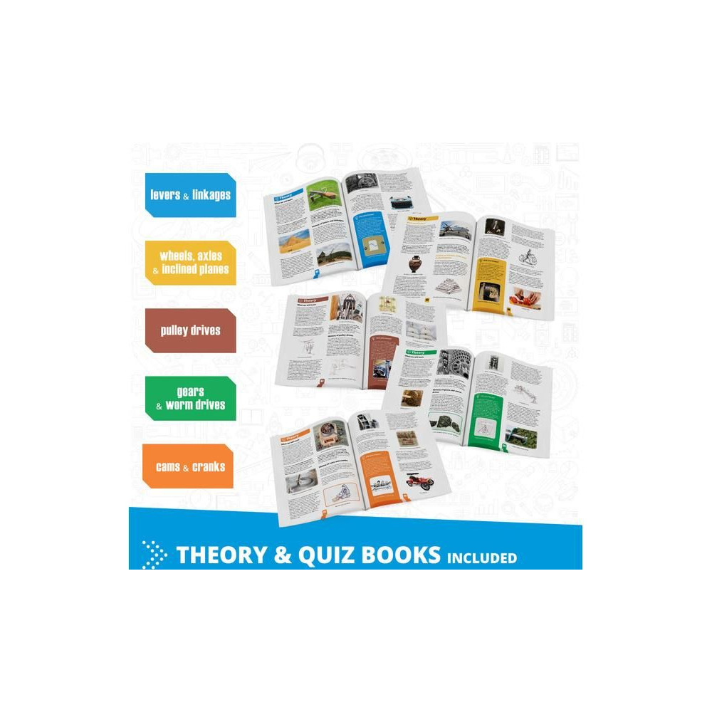 Ez a készlet a "Discovering STEM" sorozat 5 alapkészletének kombinációja, és az összes egyszerű gépi mechanizmust lefedi. Ezek a mechanizmusok mechanikai előnyt nyújtanak, és számos gépnek és berendezésnek kulcsfontosságú elemei. Arra szolgálnak, hogy megsokszorozzák vagy csökkentsék az erőt, növeljék vagy csökkentsék a sebességet, és átalakítsák az egyik típusú mozgást egy másikká. Építs 60 működő modellt, amelyek lefedik a kar, ék, kerék és tengely, csavar, ferde sík, csiga, valamint a fejlettebb fogaskerekek és karok témakörét! Az összes modell megépítéséhez könnyen érthető útmutatót találsz az interneten vagy a mellékelt füzetekben. Ezek az átfogó füzetek részletes magyarázatot adnak az alkalmazott különböző fizikai alapelvekről, és innovatív kísérleti tevékenységeket tartalmaznak a gyakorlati tanuláshoz. Minden fejezethez kvízrészlet is tartozik, ahol tesztelheted az újonnan megszerzett tudásodat!