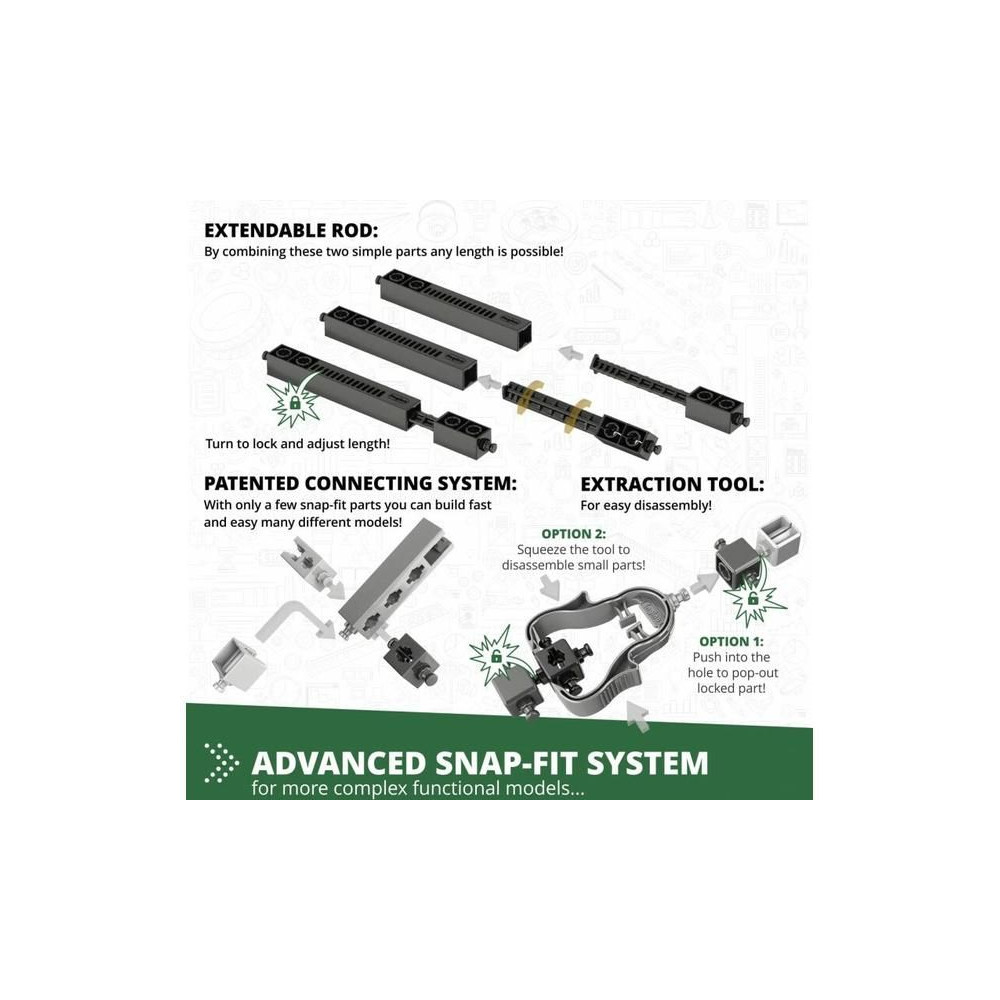- Innovatív kialakítás: a szabadalmaztatott pattintható csatlakoztathatóság és a többirányú forgók lehetővé teszik, hogy különböző szögekből, akár 6 oldalról egyszerre építsenek.