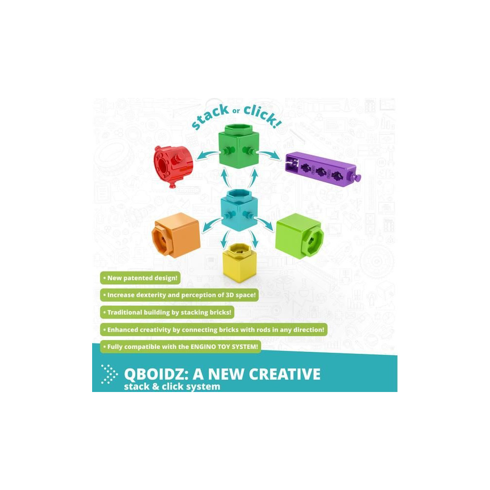 Az Engino kockák életkor szerint 4 alrendszerre vannak felosztva. A Baby Qboidz a biztonságot és a motoros készségek fejlesztését célozza 1,5 éves kortól. A Qboidz 3 éves kortól néhány speciális összekötő elemmel egészül ki, és a kognitív fejlődésre összpontosít. Engino Classic, amelyek az eredeti, eredeti kockák 6 éves kortól a gyermekek számára, lehetővé téve a komplex építést több tengelyen. Engino Mechanics 9 éves kortól, olyan műszaki részekkel, mint a fogaskerekek és a fogaskerekek.