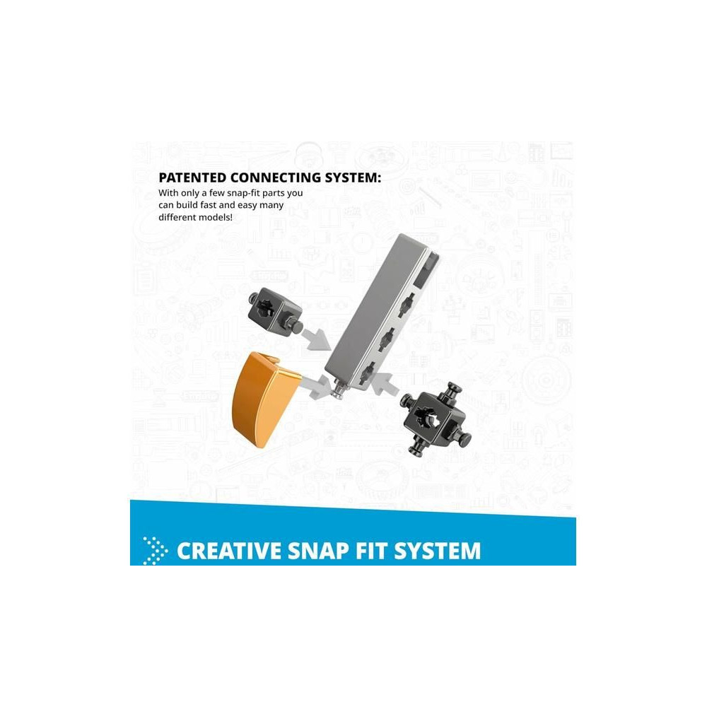 - Innovatív kialakítás: a szabadalmaztatott pattintható csatlakoztathatóság és a túlméretezett forgócsapok lehetővé teszik, hogy különböző szögekből és egyszerre 6 oldalról építkezhess.
