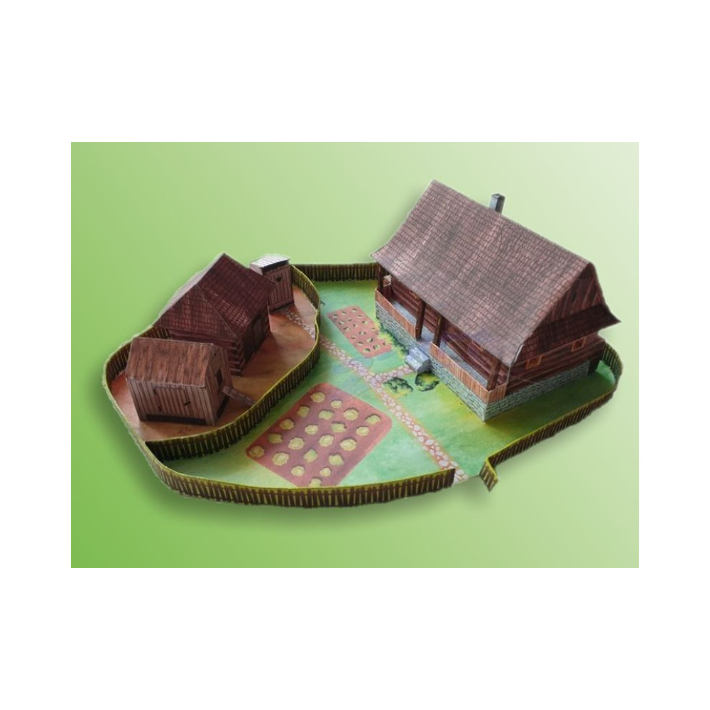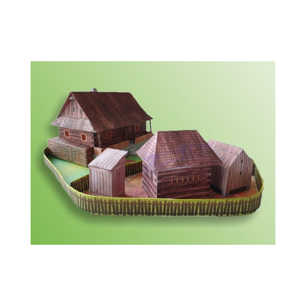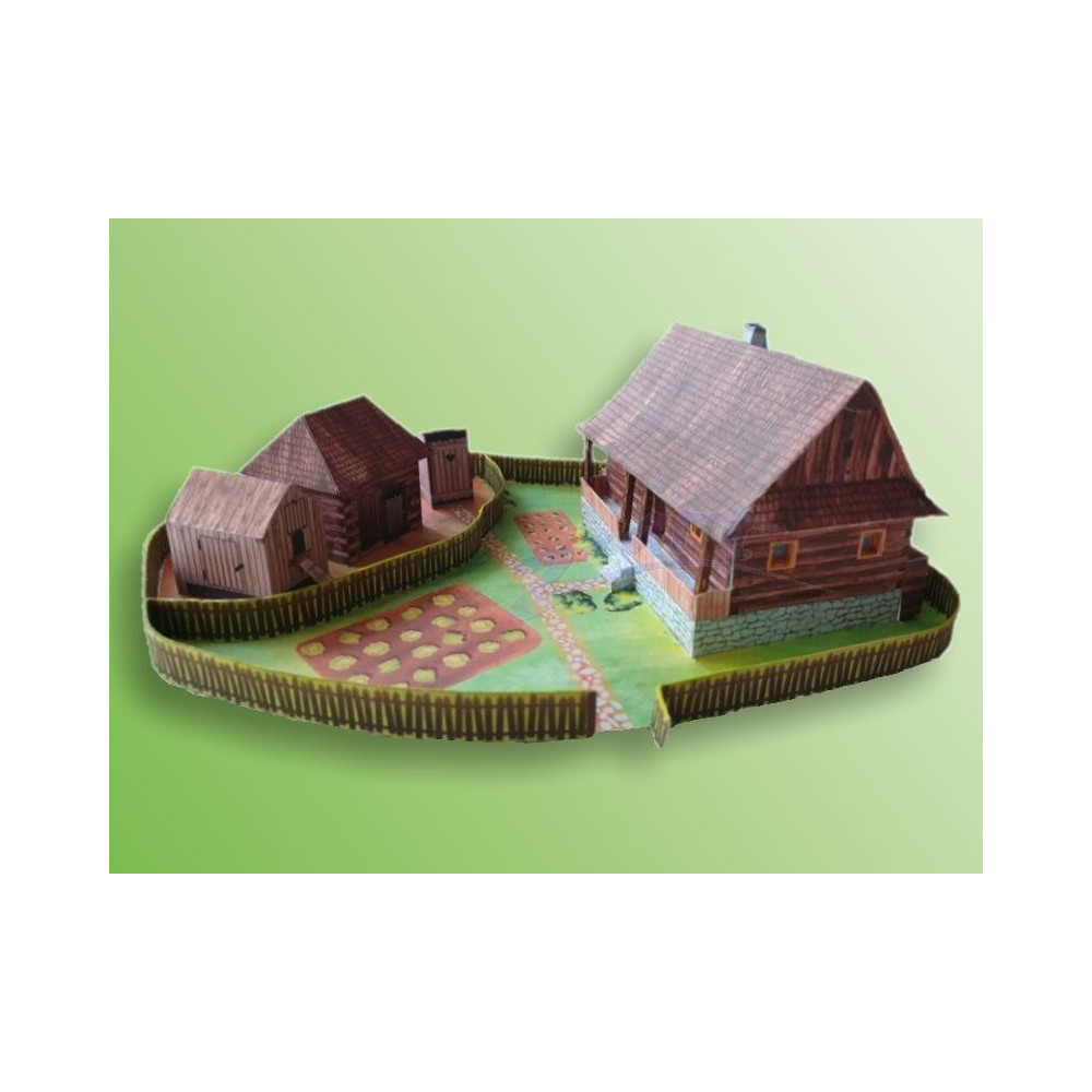 Model starej valašskej chalupy so záhradou a samostatným hospodárskym zázemím, ktoré pozostáva zo suchého záchodu - "kadibúdky", kozieho chlieva a kurína. Záhrada je oplotená a hospodárska časť je tiež oddelená od zvyšku záhrady plotom. Väčšina textúr v tomto modeli je nakreslená ručne. Táto vystrihovačka dáva priestor aj vašej vlastnej kreativite - ak chcete, môžete si vybrať biely model tohto domu so všetkými doplnkami bez textúr, ktorý si môžete dotvoriť podľa vlastnej fantázie.