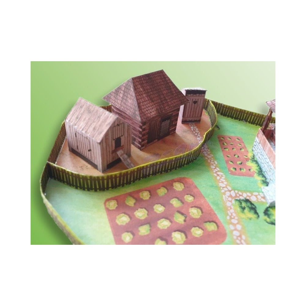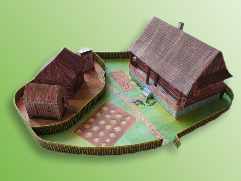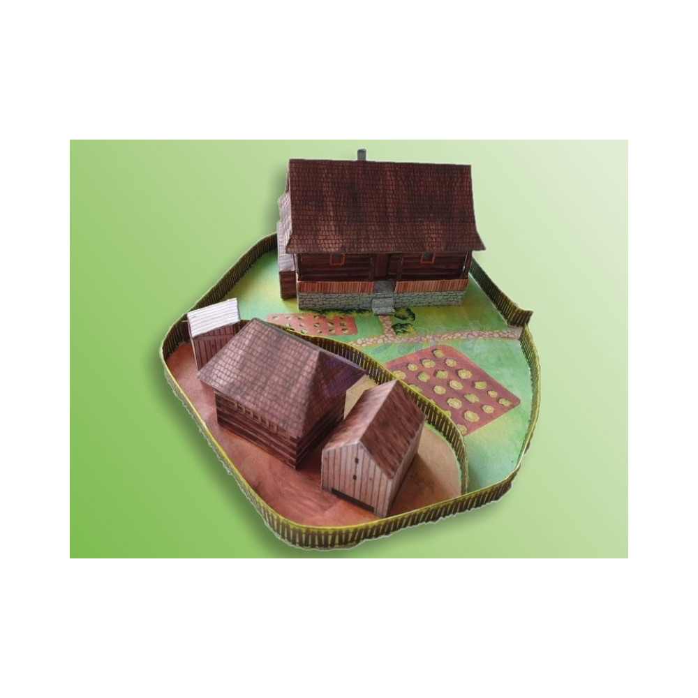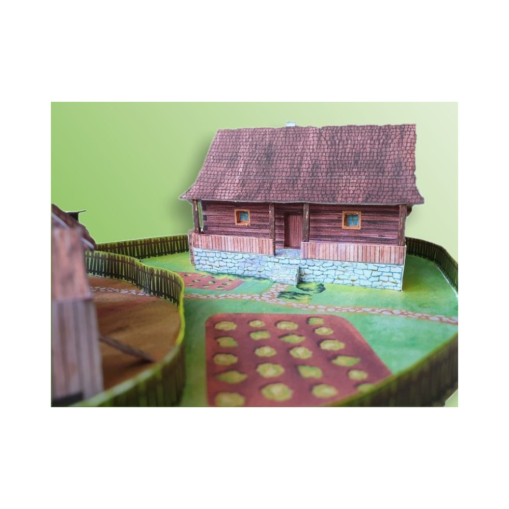 Model starej valašskej chalupy so záhradou a samostatným hospodárskym zázemím, ktoré pozostáva zo suchého záchodu - "kadibúdky", kozieho chlieva a kurína. Záhrada je oplotená a hospodárska časť je tiež oddelená od zvyšku záhrady plotom. Väčšina textúr v tomto modeli je nakreslená ručne. Táto vystrihovačka dáva priestor aj vašej vlastnej kreativite - ak chcete, môžete si vybrať biely model tohto domu so všetkými doplnkami bez textúr, ktorý si môžete dotvoriť podľa vlastnej fantázie.