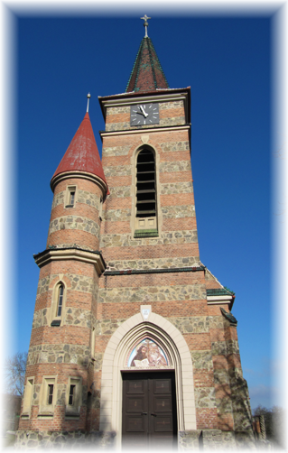 Fasáda kostola sa vyznačuje kombináciou farieb a stavebných materiálov - striedaním kamenného muriva a rustikovaných tehál. Ďalším dekoratívnym prvkom sú ornamenty na streche, ktoré tvoria škridly glazované v rôznych farbách.