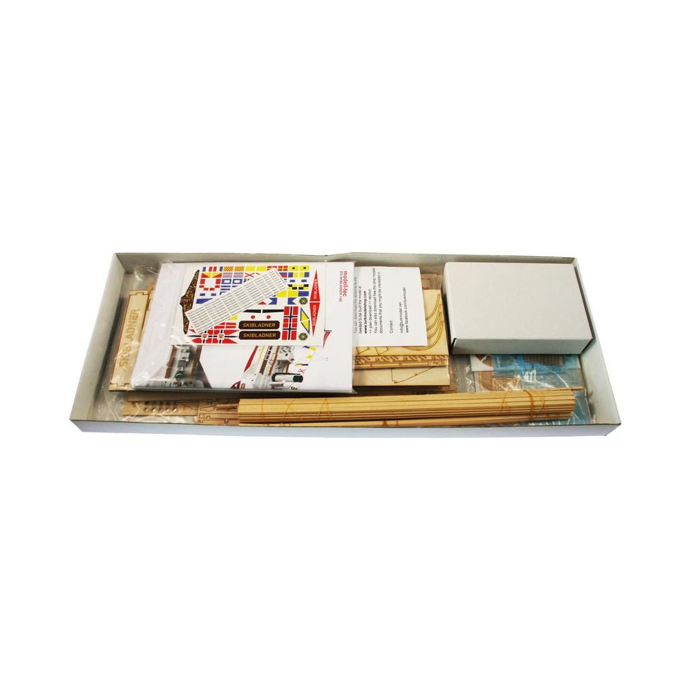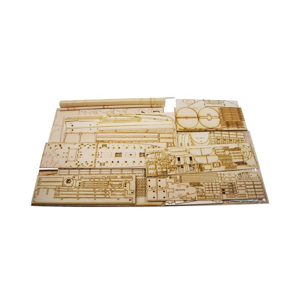 A doboz fedelét kinyitva a modell fából készült rétegelt lemezből készült alkatrészeit, egy öntvénykészletet, műanyag átlátszó buborékcsomagba zárt kis alkatrészeket, egy rajzkészletet és egy kézikönyvet talál.
