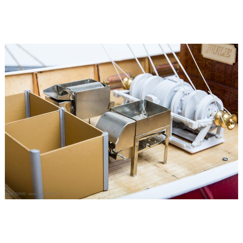 A modell fénypontja azonban a biztonsági hálók. A teljes fogószerkezet a vitorlacsörlők felszerelésével teljesen működőképes lehet. A hálók menet közben is leereszthetők és behúzhatók. A készlet a jól bevált aero-naut lézeres technológiával készül, amely garantálja az egyes alkatrészek nagyon pontos illeszkedését. A Jule szinte teljes egészében fából készül, és finom mahagónival van kiegészítve. A részletes építési útmutató sok képpel az építési fázisról biztosítja a modell gyors és egyszerű összeszerelését.