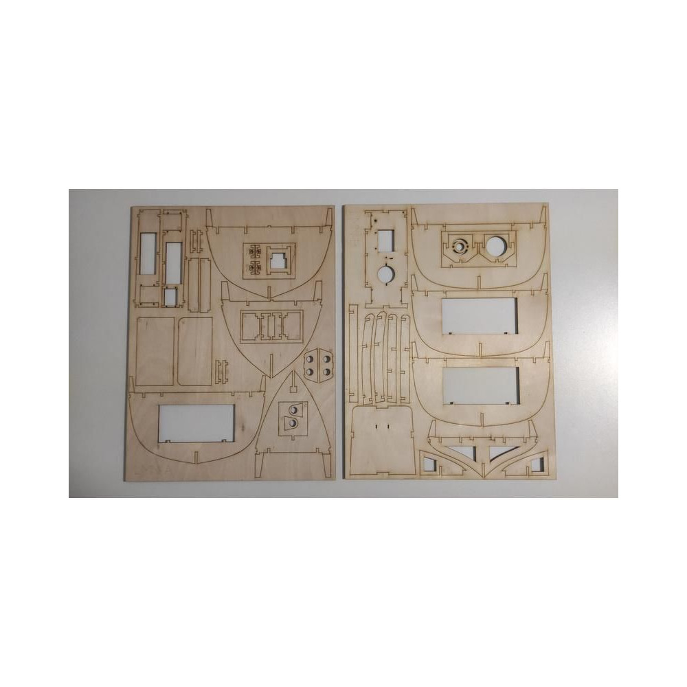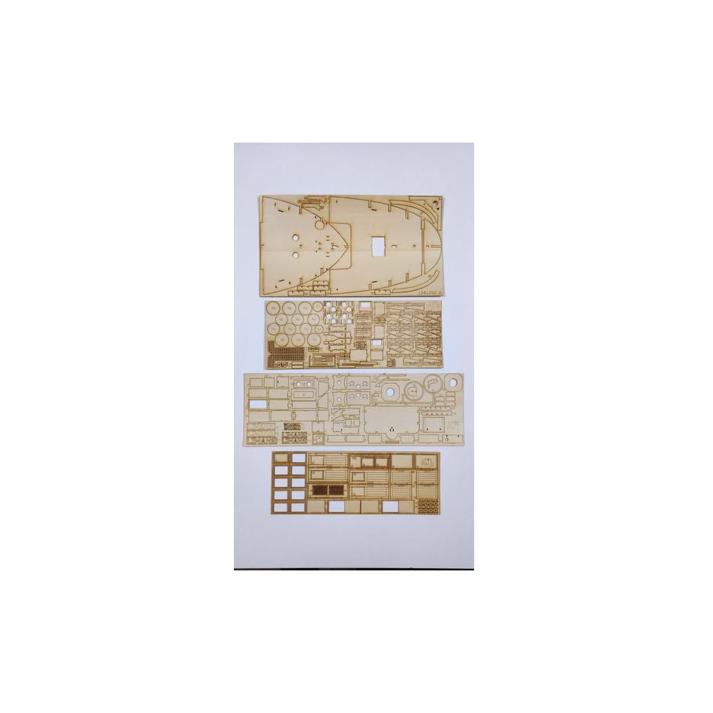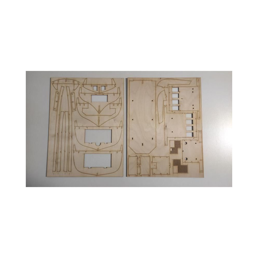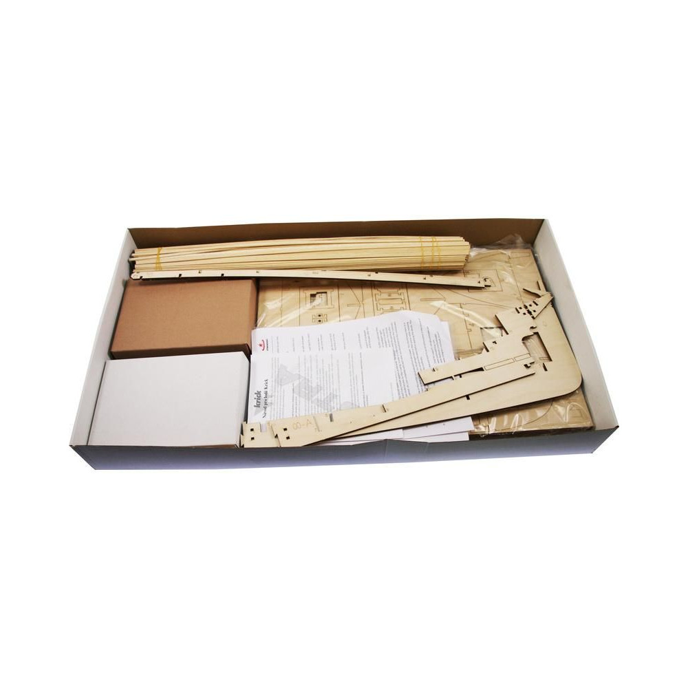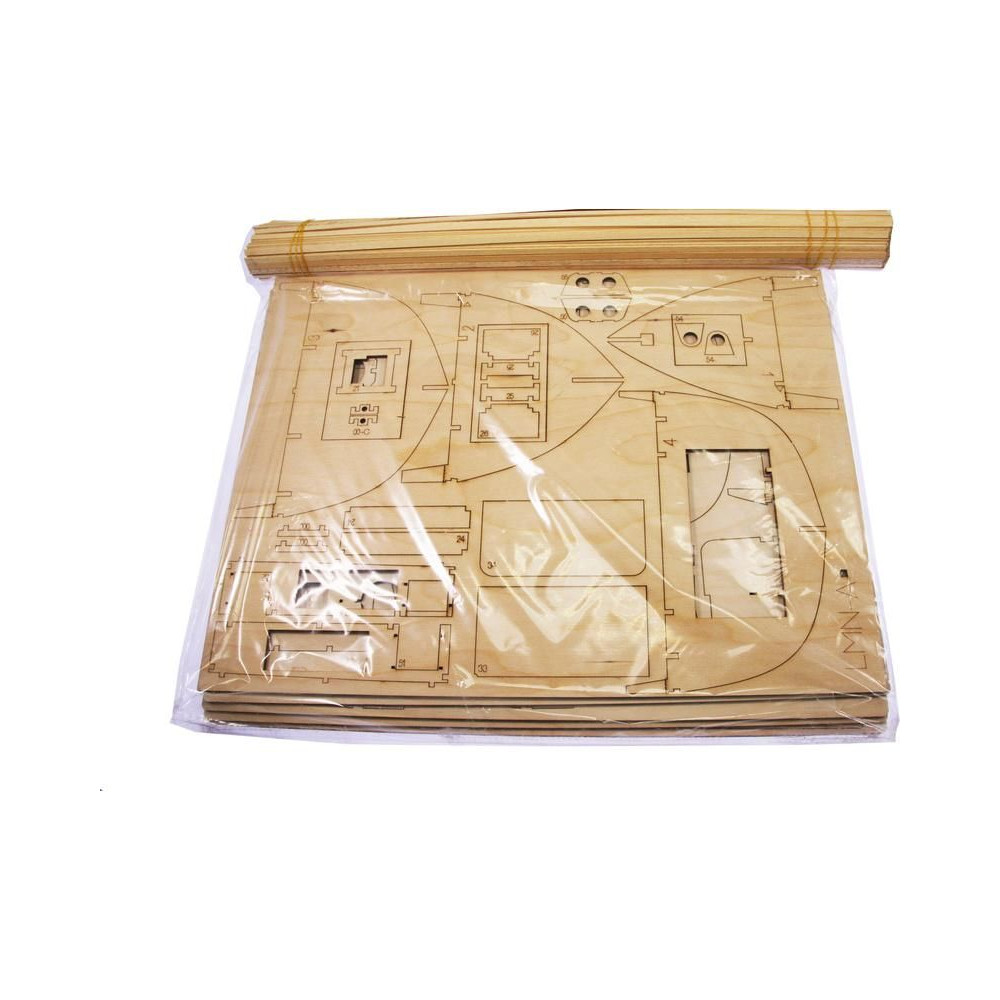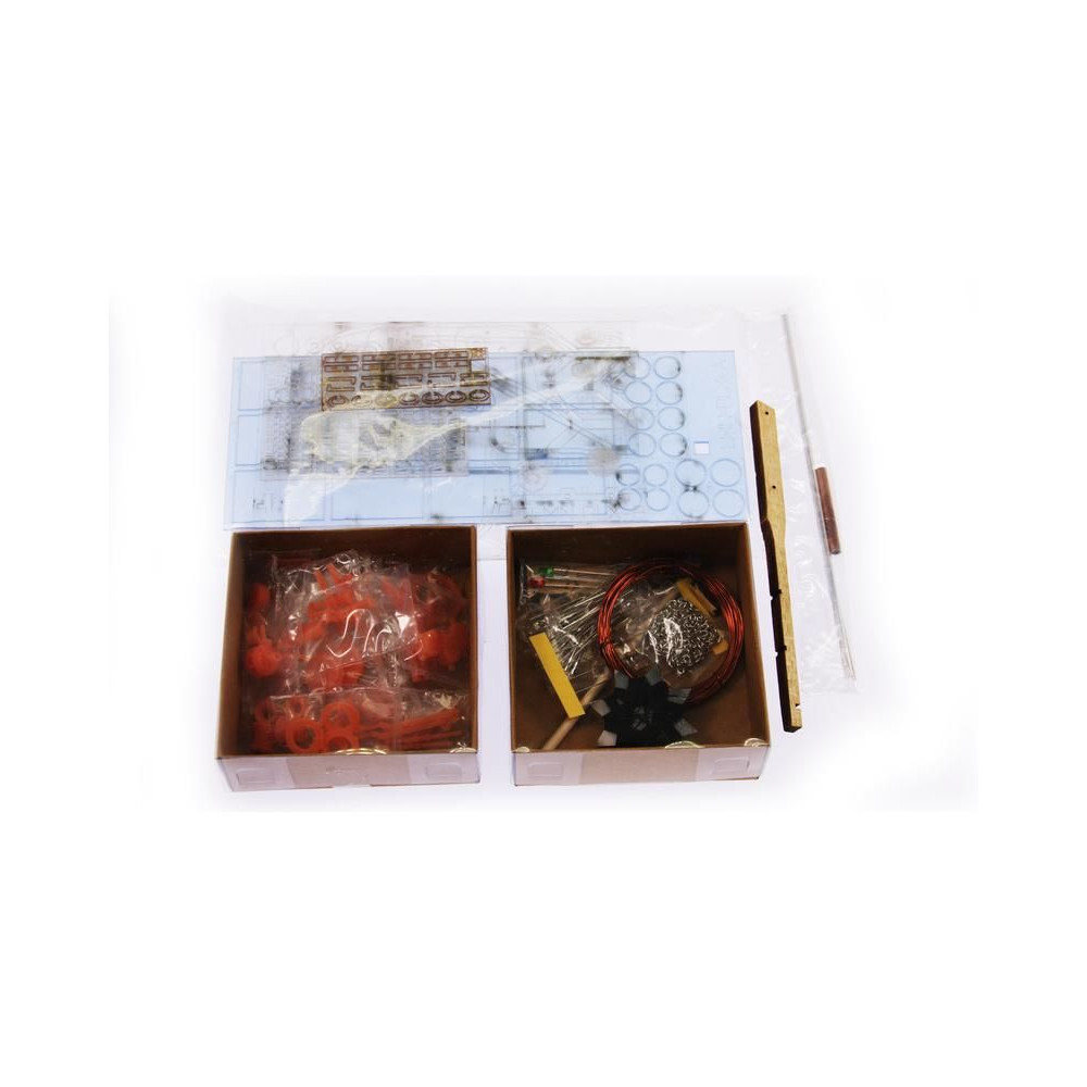 A doboz fedelét kinyitva a modell rétegelt lemezből készült fa alkatrészeit, egy sor öntvényt, zacskókba zárt apró alkatrészeket, egy rajzcsomagot és egy kézikönyvet talál.