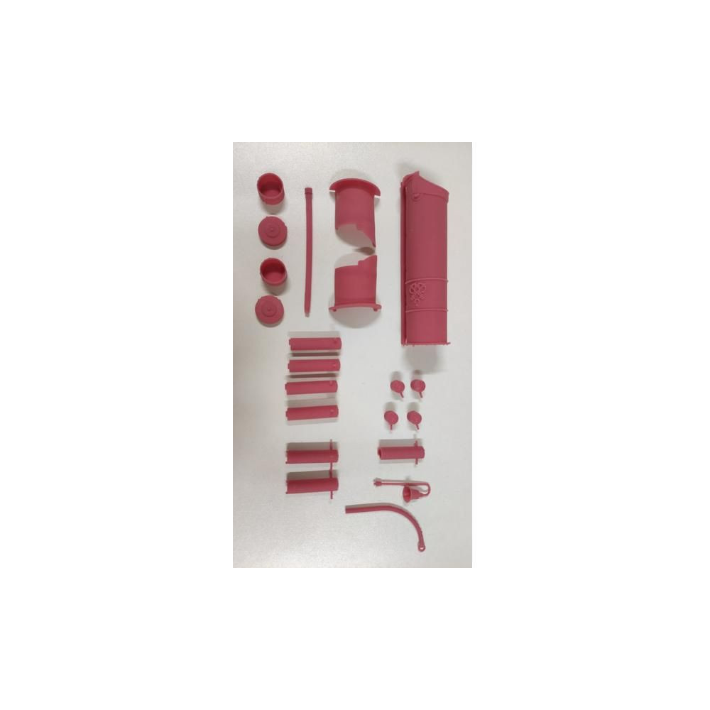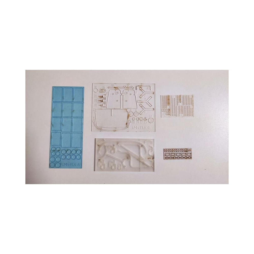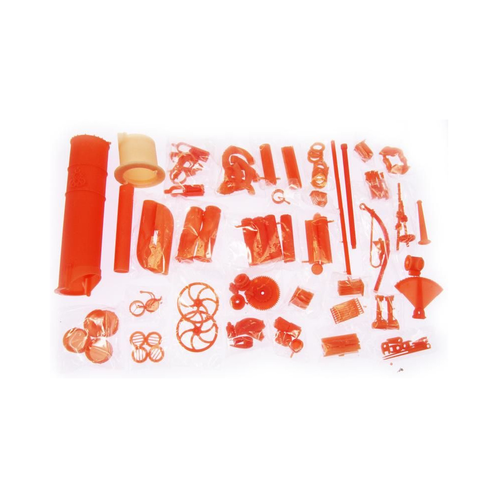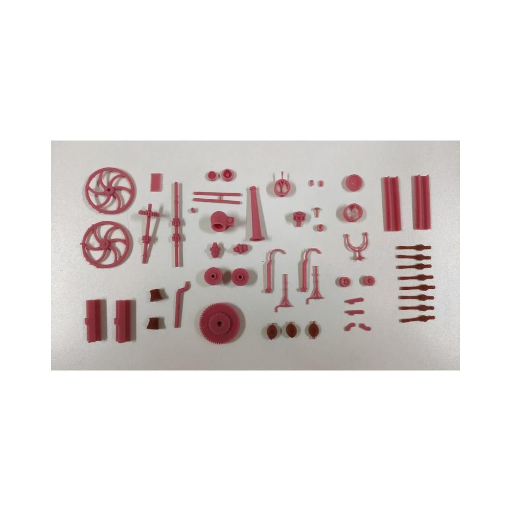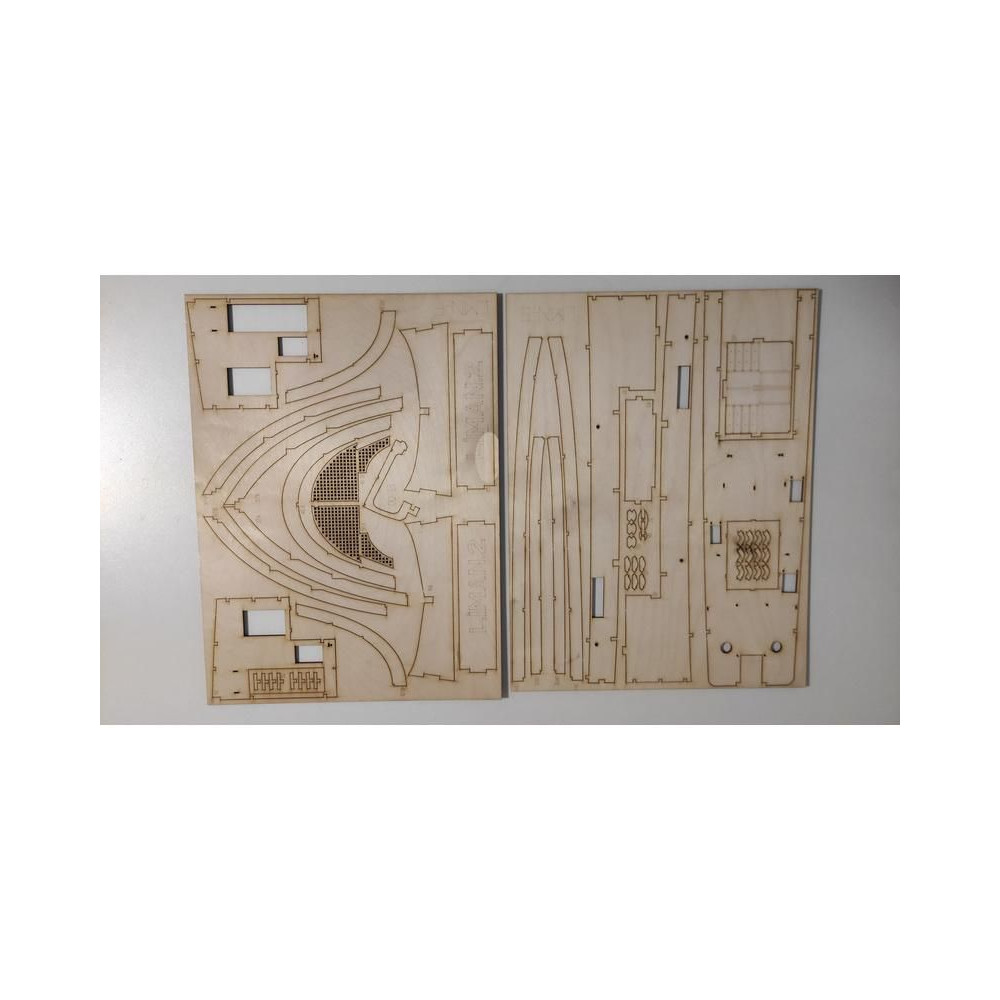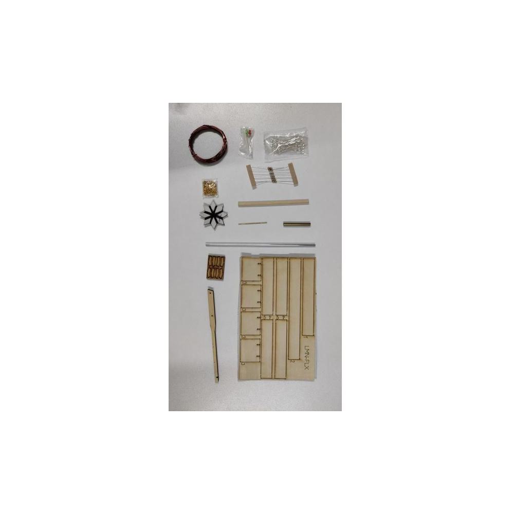 A doboz fedelét kinyitva a modell rétegelt lemezből készült fa alkatrészeit, egy sor öntvényt, zacskókba zárt apró alkatrészeket, egy rajzcsomagot és egy kézikönyvet talál.