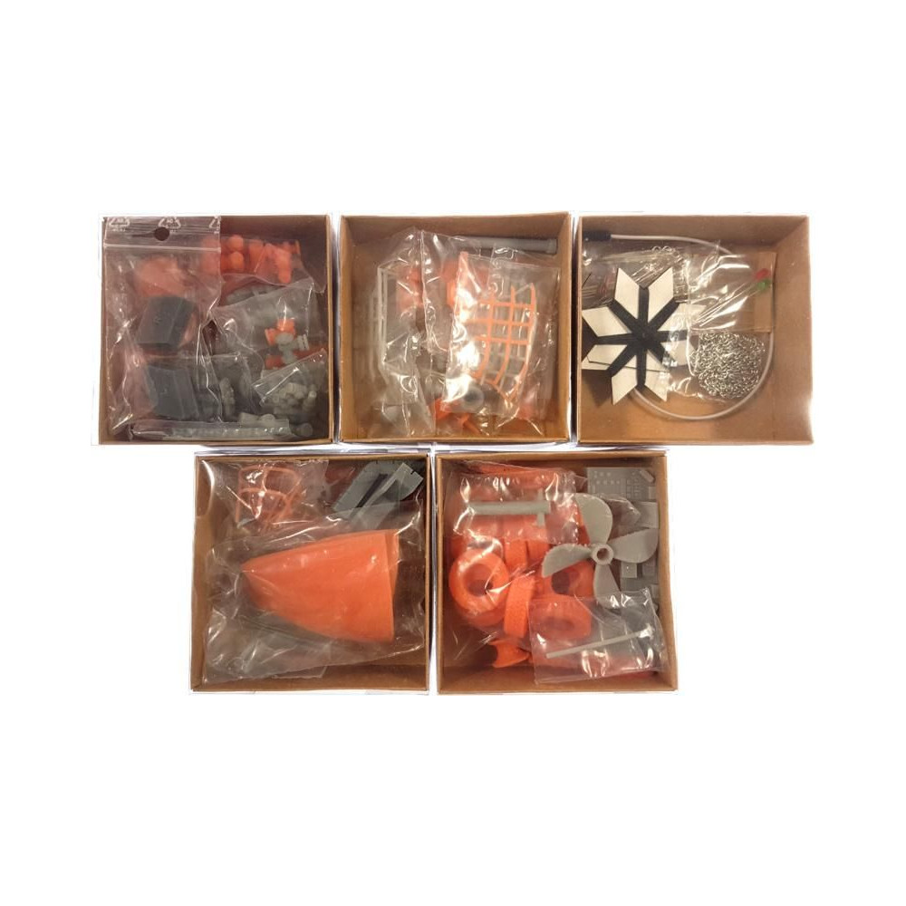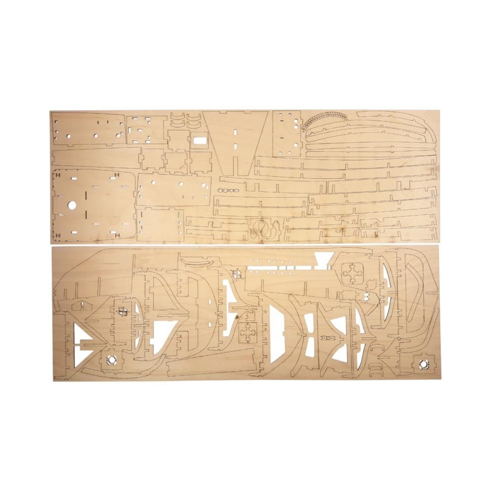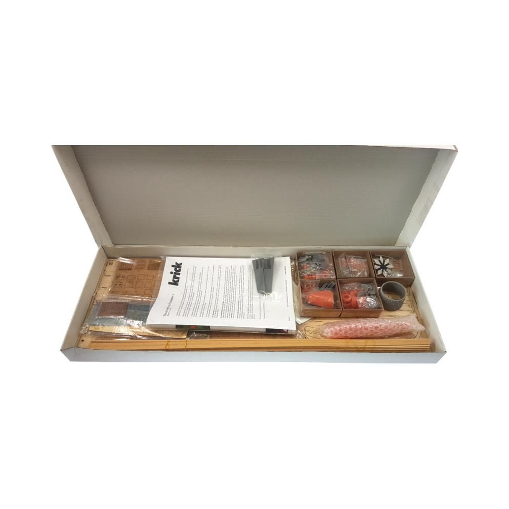 A doboz fedelének kinyitása után a rétegelt lemez modell fa alkatrészeinek átfogó készletét, egy léckészletet, 3D nyomtatási alkatrészeket bliszteres csomagolásban és képes útmutatót talál.
