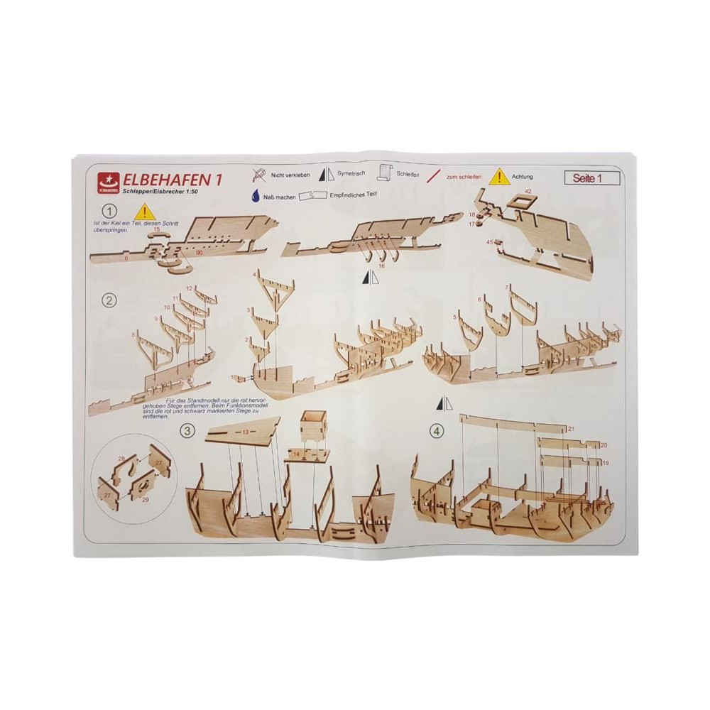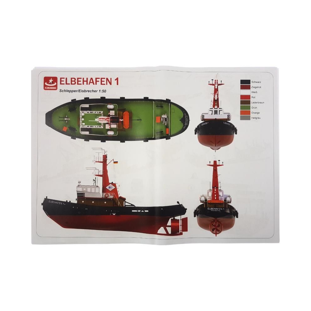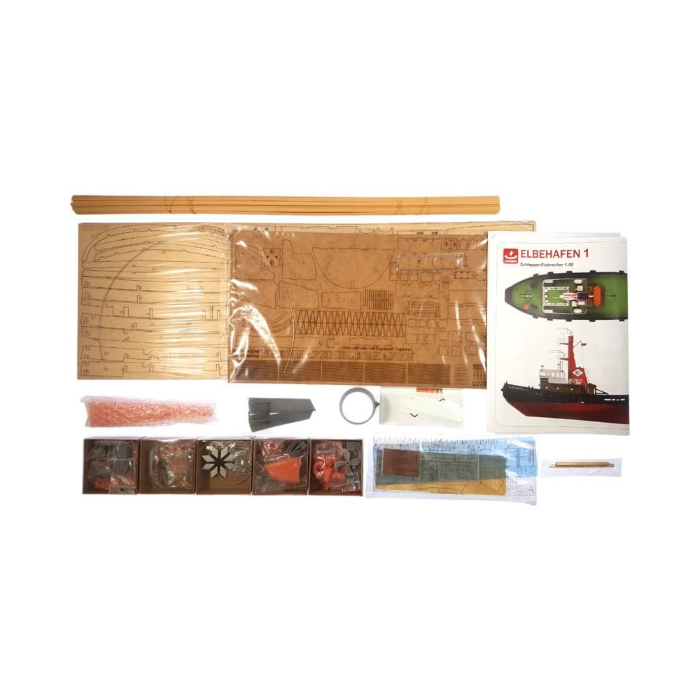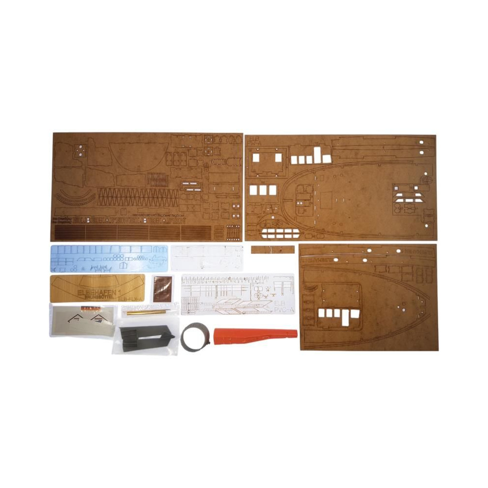 Elbehafen 1 modellkészlet 1:50 méretarányban. Haladó modellezők számára. A modell hossza 605 mm. A csomag tartalmazza az építéshez szükséges alkatrészeket. Lézerrel vágott alkatrészekből készült fa hajótest, 3D nyomtatott részletekkel kiegészítve. Átlátható építési terv mellékelve. A prototípus egy folyami jégtörő, amely az Elba torkolatánál állomásozik.