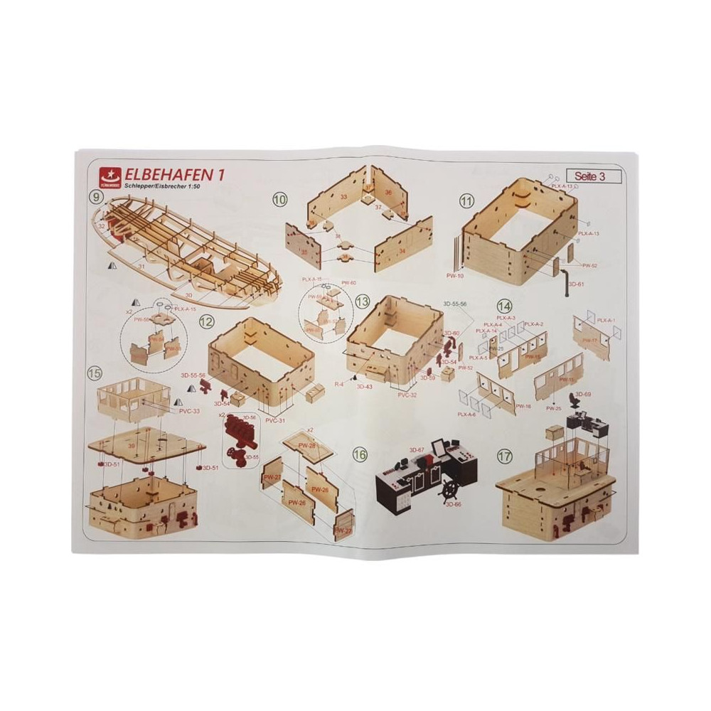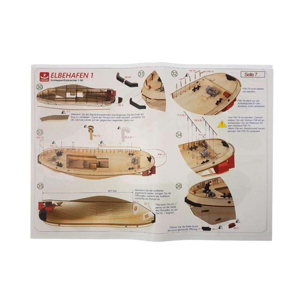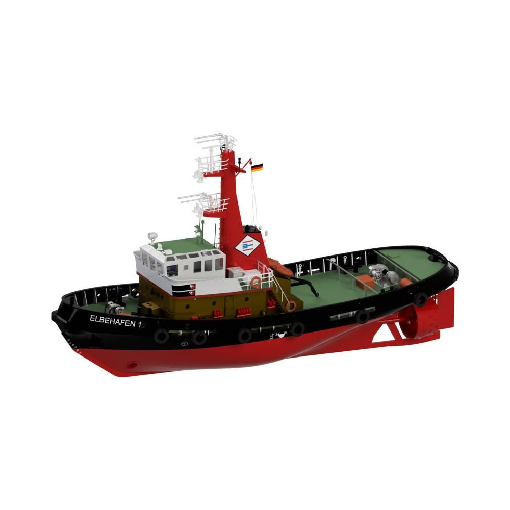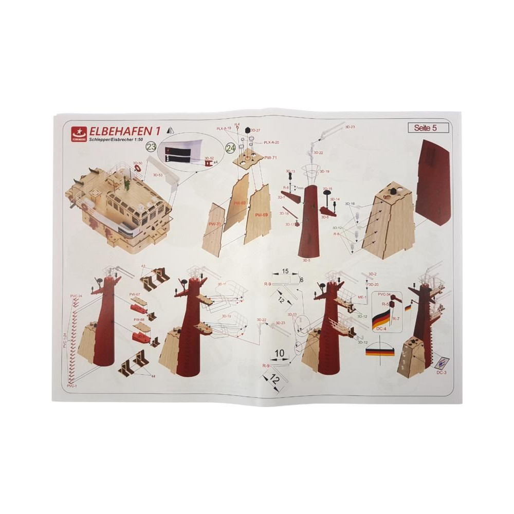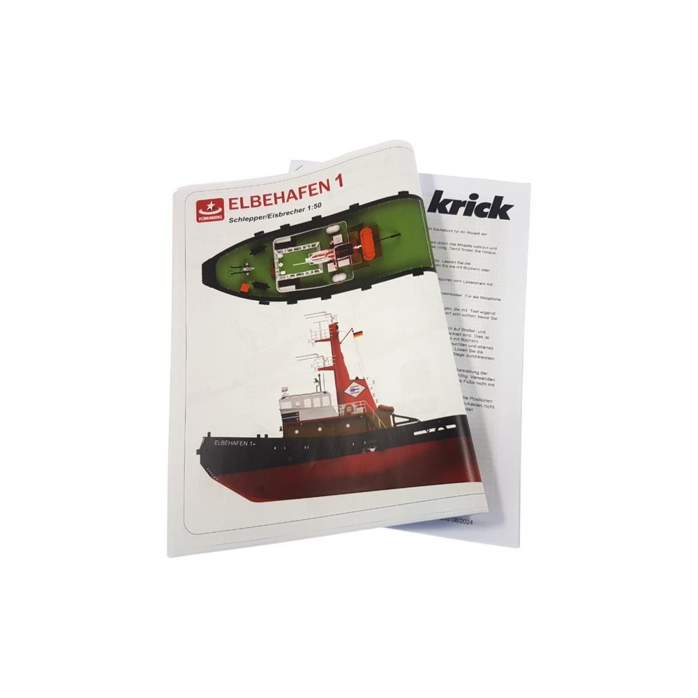 Elbehafen 1 modellkészlet 1:50 méretarányban. Haladó modellezők számára. A modell hossza 605 mm. A csomag tartalmazza az építéshez szükséges alkatrészeket. Lézerrel vágott alkatrészekből készült fa hajótest, 3D nyomtatott részletekkel kiegészítve. Átlátható építési terv mellékelve. A prototípus egy folyami jégtörő, amely az Elba torkolatánál állomásozik.