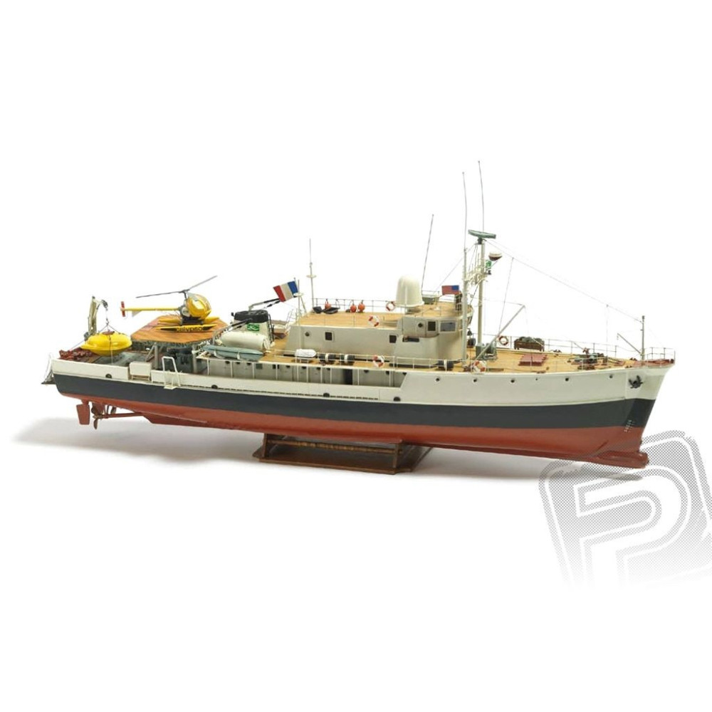 e 1:45 méretarányban, tapasztalt hajóépítők számára készült. ACalypso hajótest műanyag öntvényből készült, belső rétegelt lemez megerősítésekkel, a fedélzet és a felépítmény rétegelt lemezből és műanyag alkatrészekből készült. A készlet tartalmazza a műanyag hajótest öntvényt és a modell befejezéséhez szükséges egyéb műanyag és fa alkatrészeket, a makett tartozékokat (pl. helyzetjelzők, horgonyok, mini tengeralattjáró, helikopter stb.), hajócsavartengelyeket perselyekkel és háromlapátos hajócsavarokat.