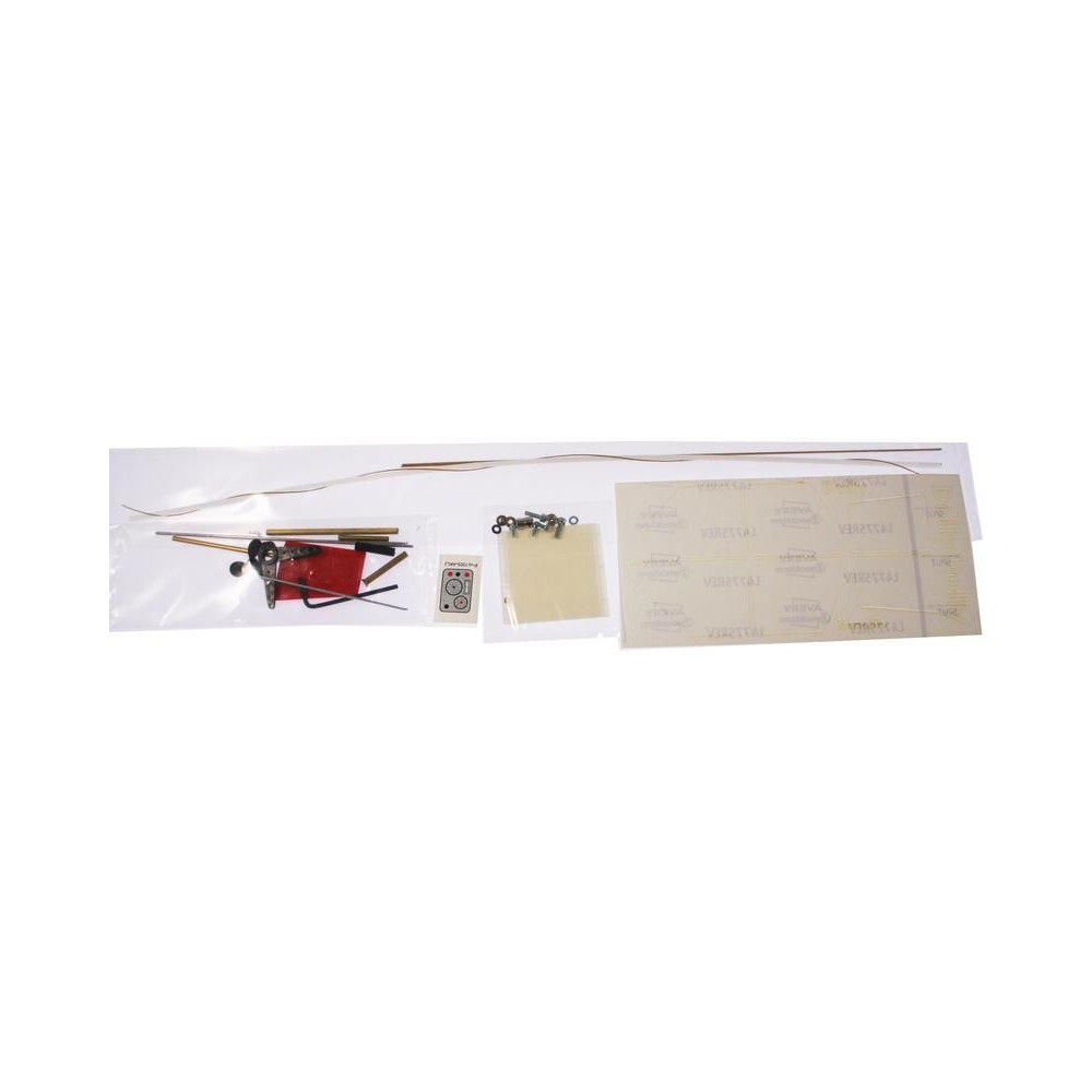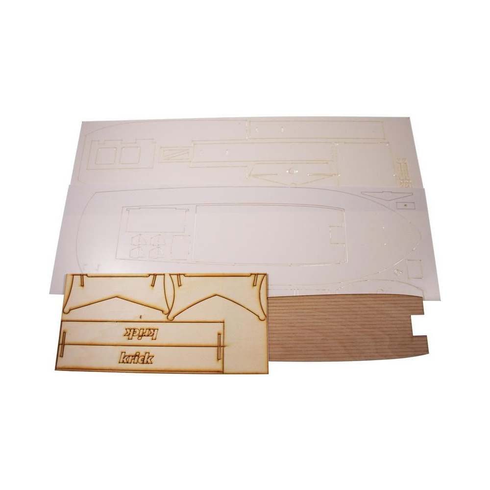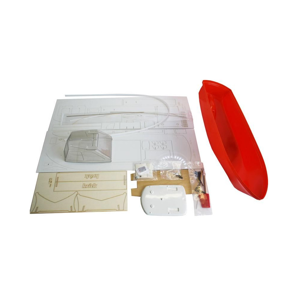 A készlet tartalmazza a hajótest formázóelemeit, a fedélzetet, a kabint átlátszó anyagból, és egyéb kis makettalkatrészeket. Komplett kormánylapát, tengelycső, légcsavar és csatlakozók. Öntapadós matricák, építési útmutató és terv.