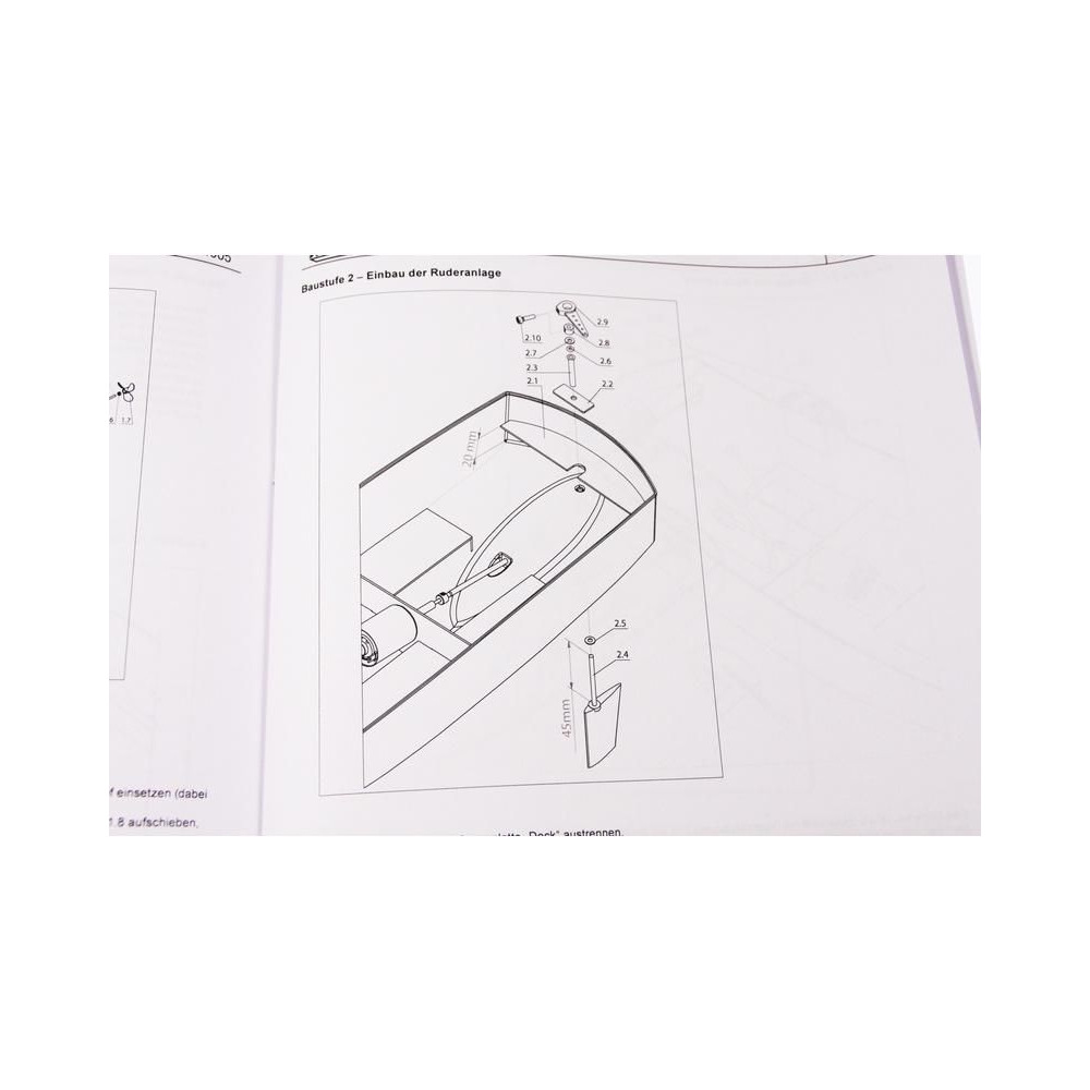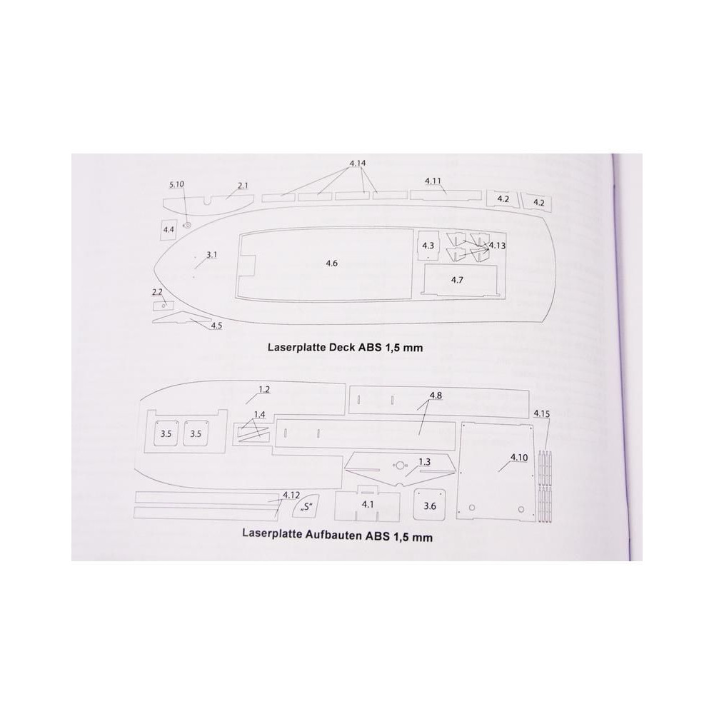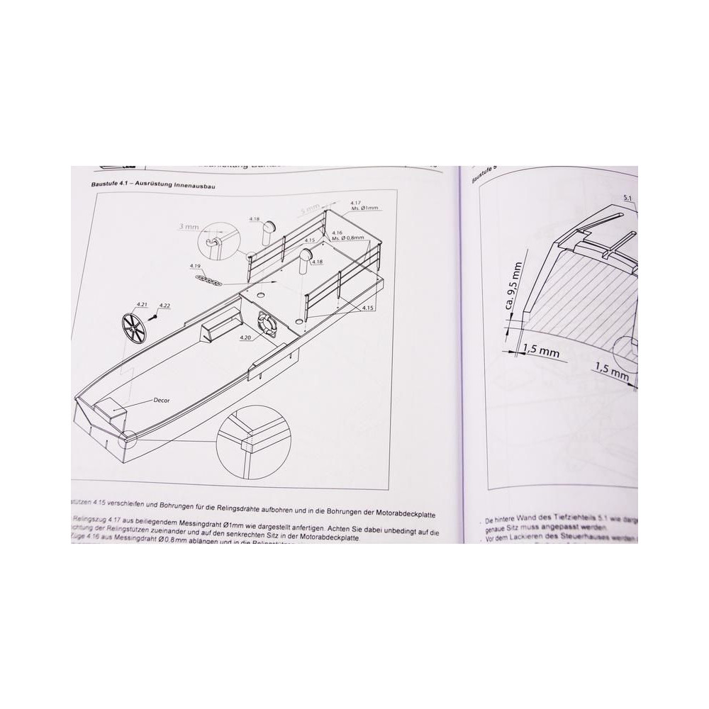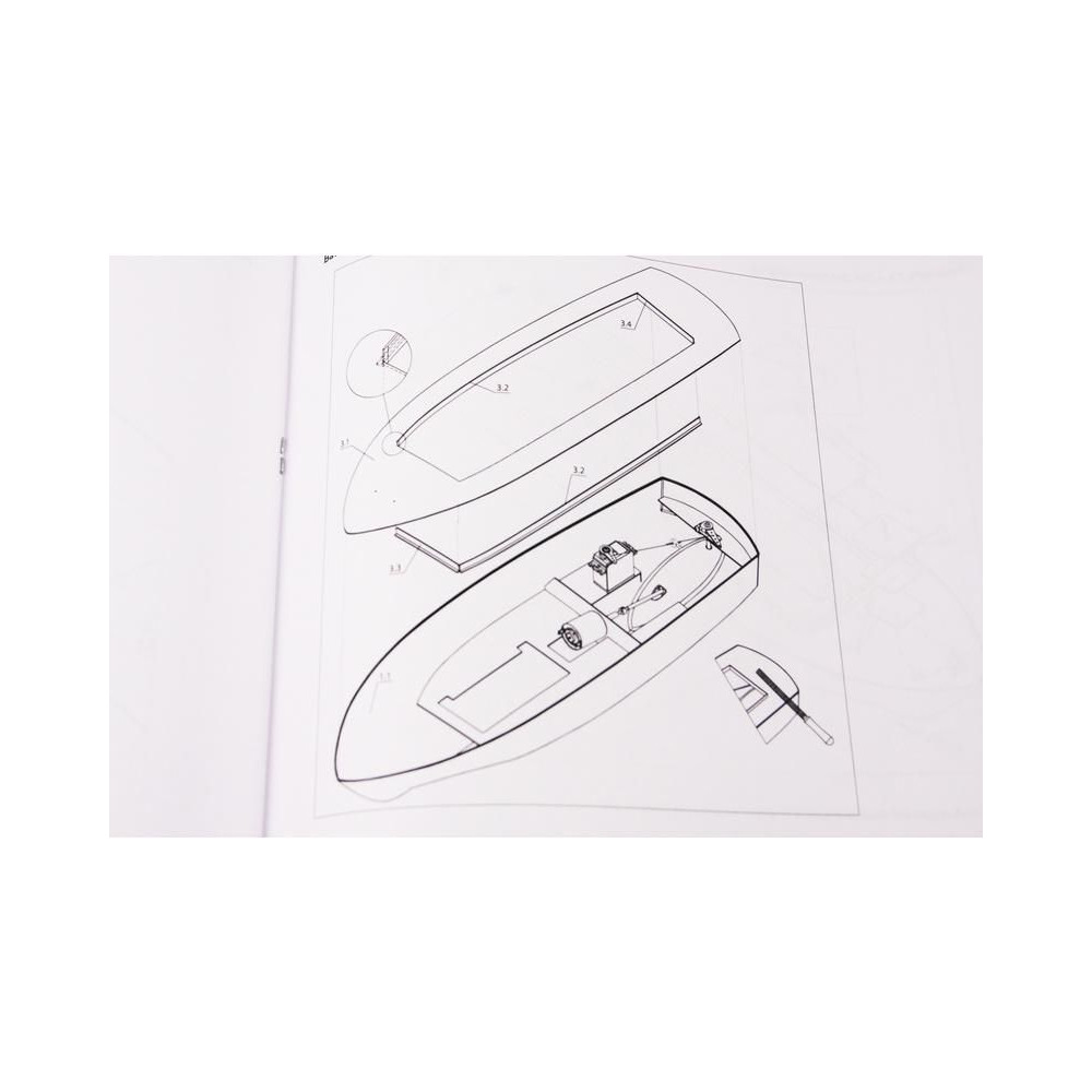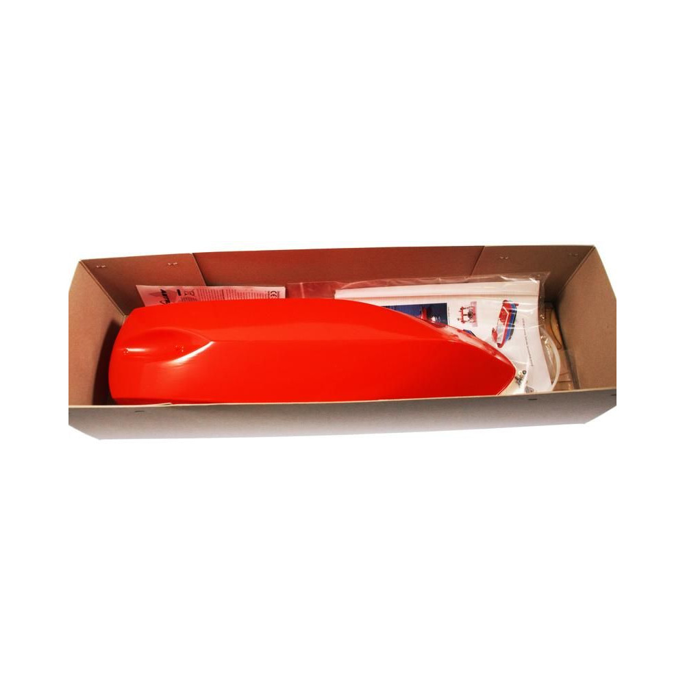 A doboz fedelét kinyitva a hajótest, a fedélzet és a kabin öntvényeit, a kis méretarányú modellalkatrészeket, a komplett kormánylapátot, a tengelycsövet, a hajócsavart és a csatlakozókat találja. Öntapadós matricák, építési útmutató és tervrajz.