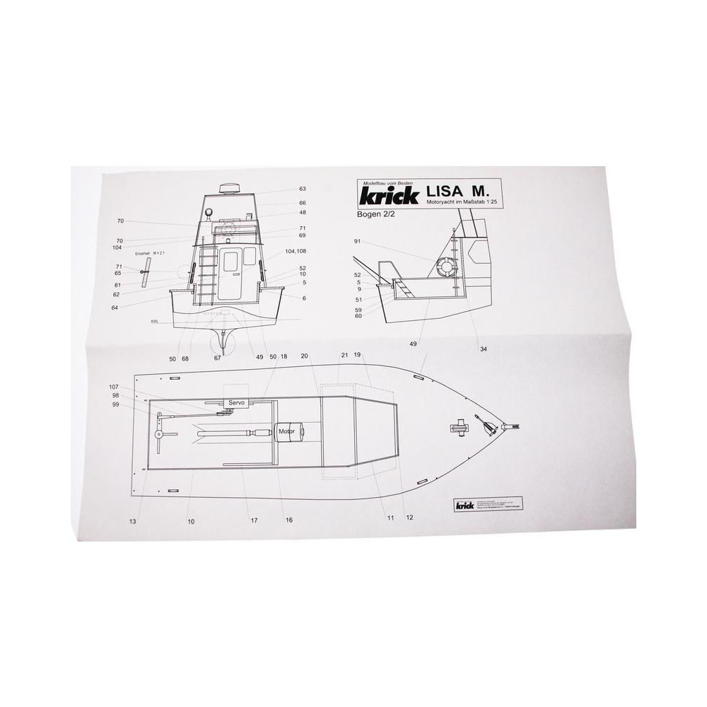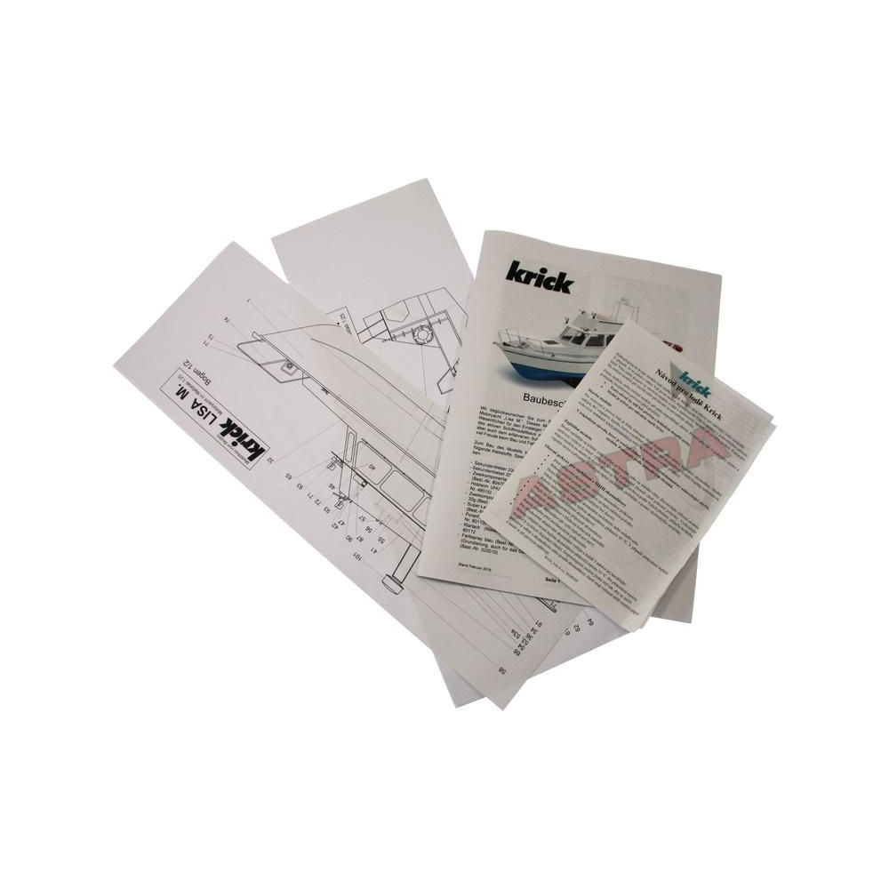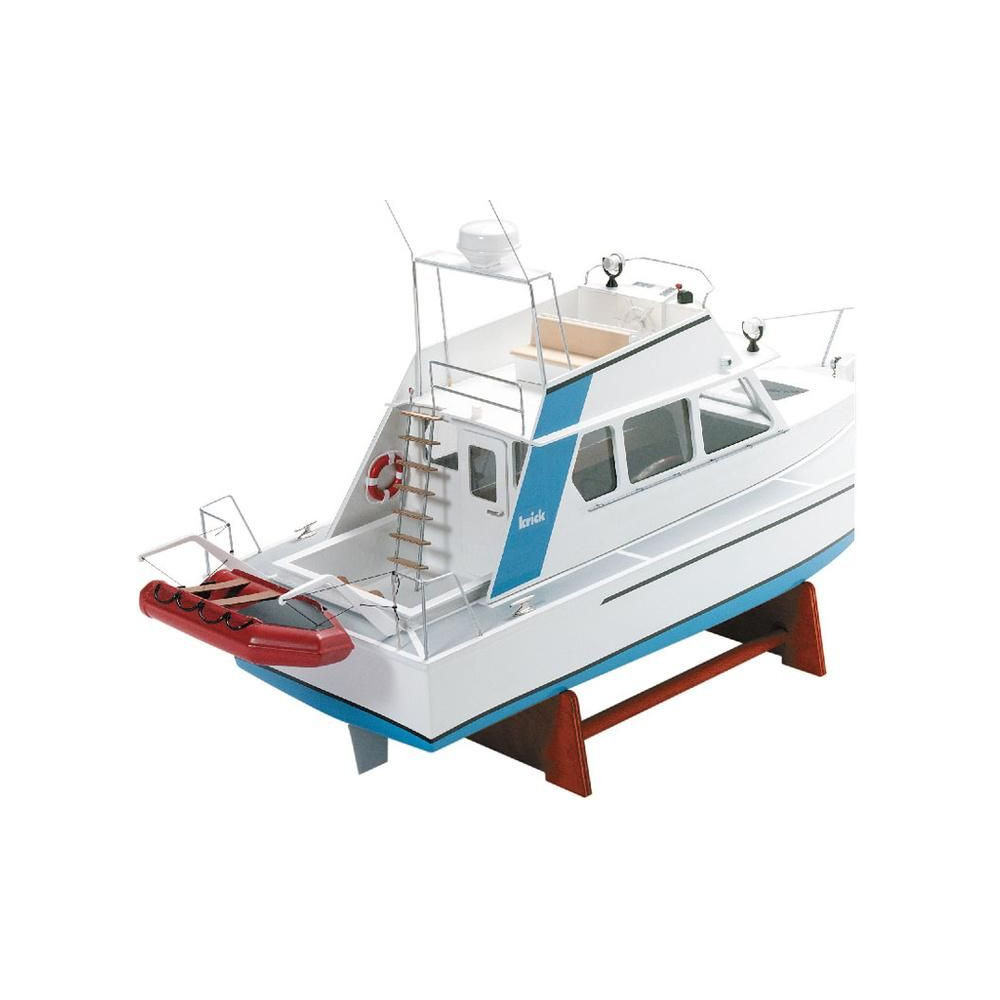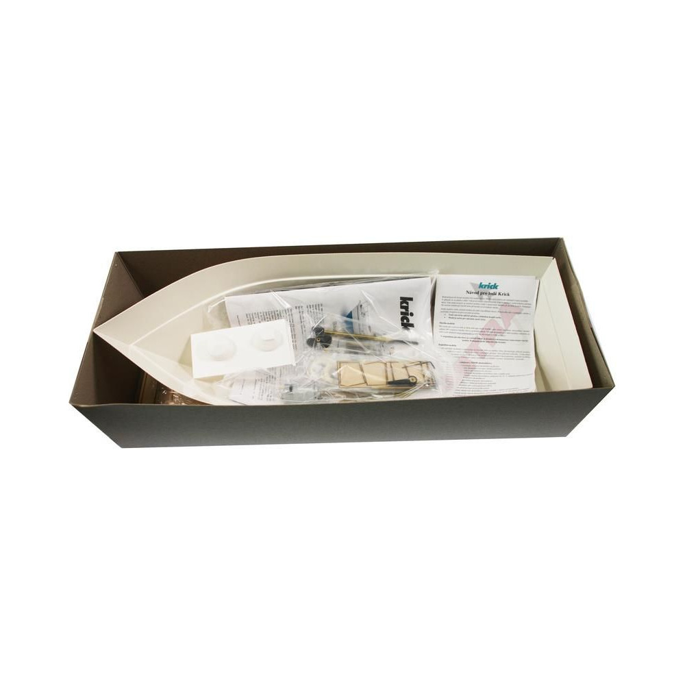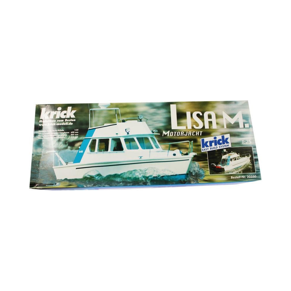 RC hajómodell készlet Krick, Lisa motoros jacht. A modell kezdő hajómodellezők számára készült. Tartalmaz műanyag hajótestet, fa fedélzeti és belső részeket, Speed 400 motort, hajócsavart tengellyel, kormánylapátot, kormánykereket, zászlót, makett alkatrészeket és apró kiegészítőket.