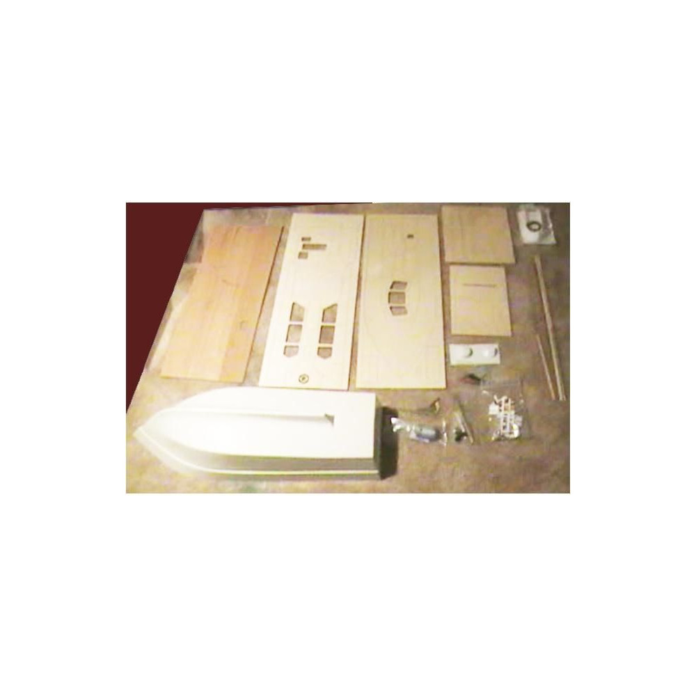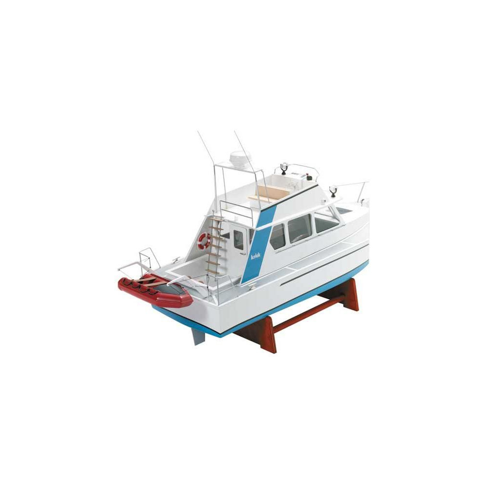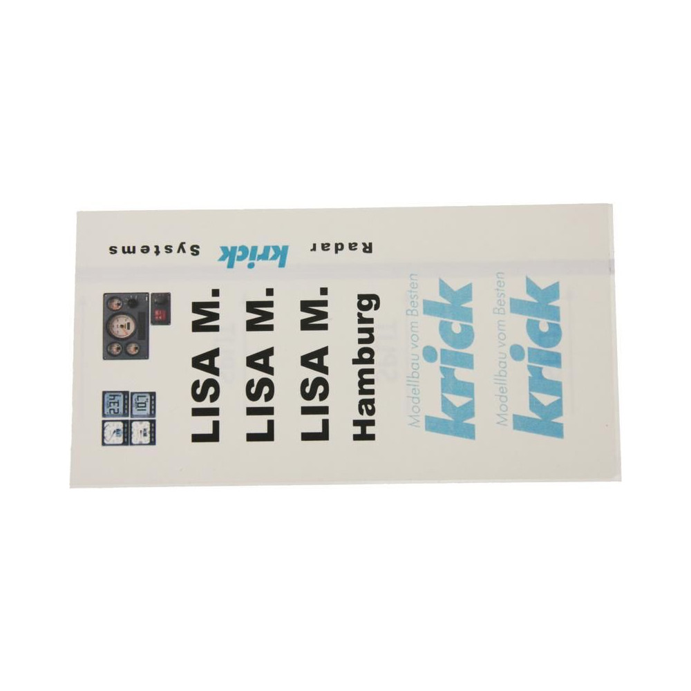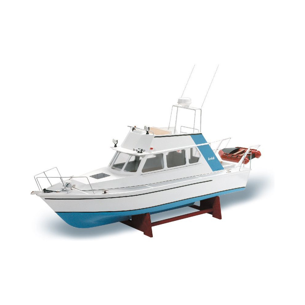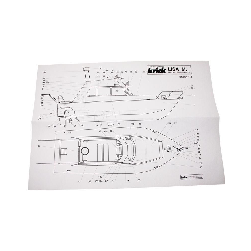 RC hajómodell készlet Krick, Lisa motoros jacht. A modell kezdő hajómodellezők számára készült. Tartalmaz műanyag hajótestet, fa fedélzeti és belső részeket, Speed 400 motort, hajócsavart tengellyel, kormánylapátot, kormánykereket, zászlót, makett alkatrészeket és apró kiegészítőket.