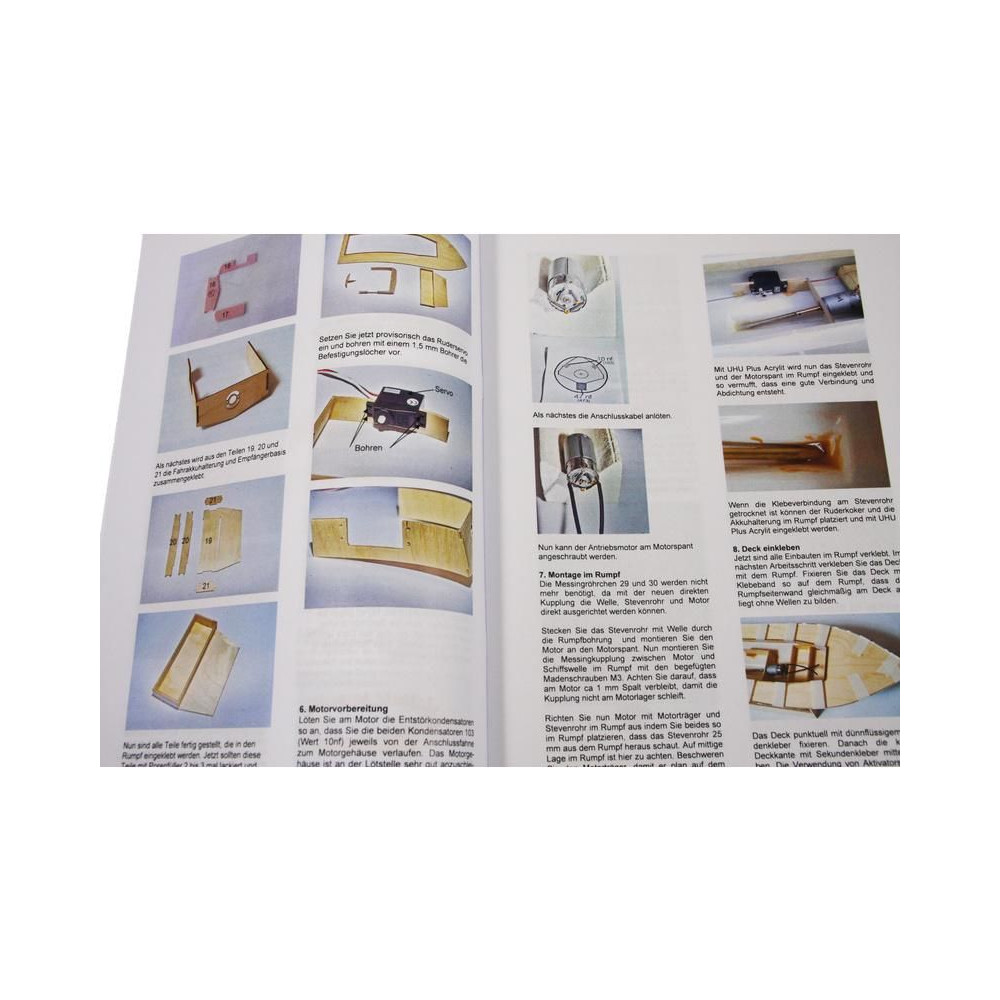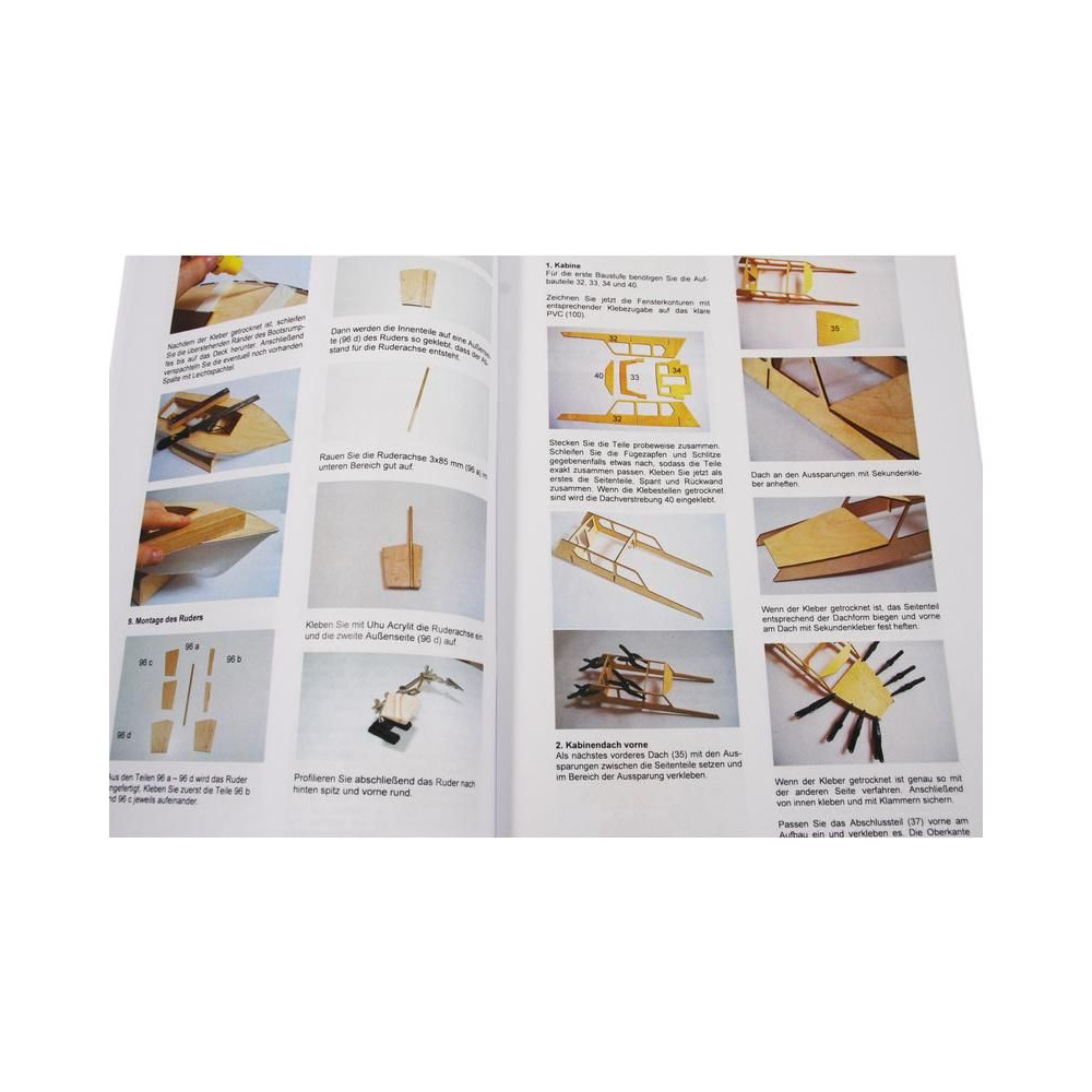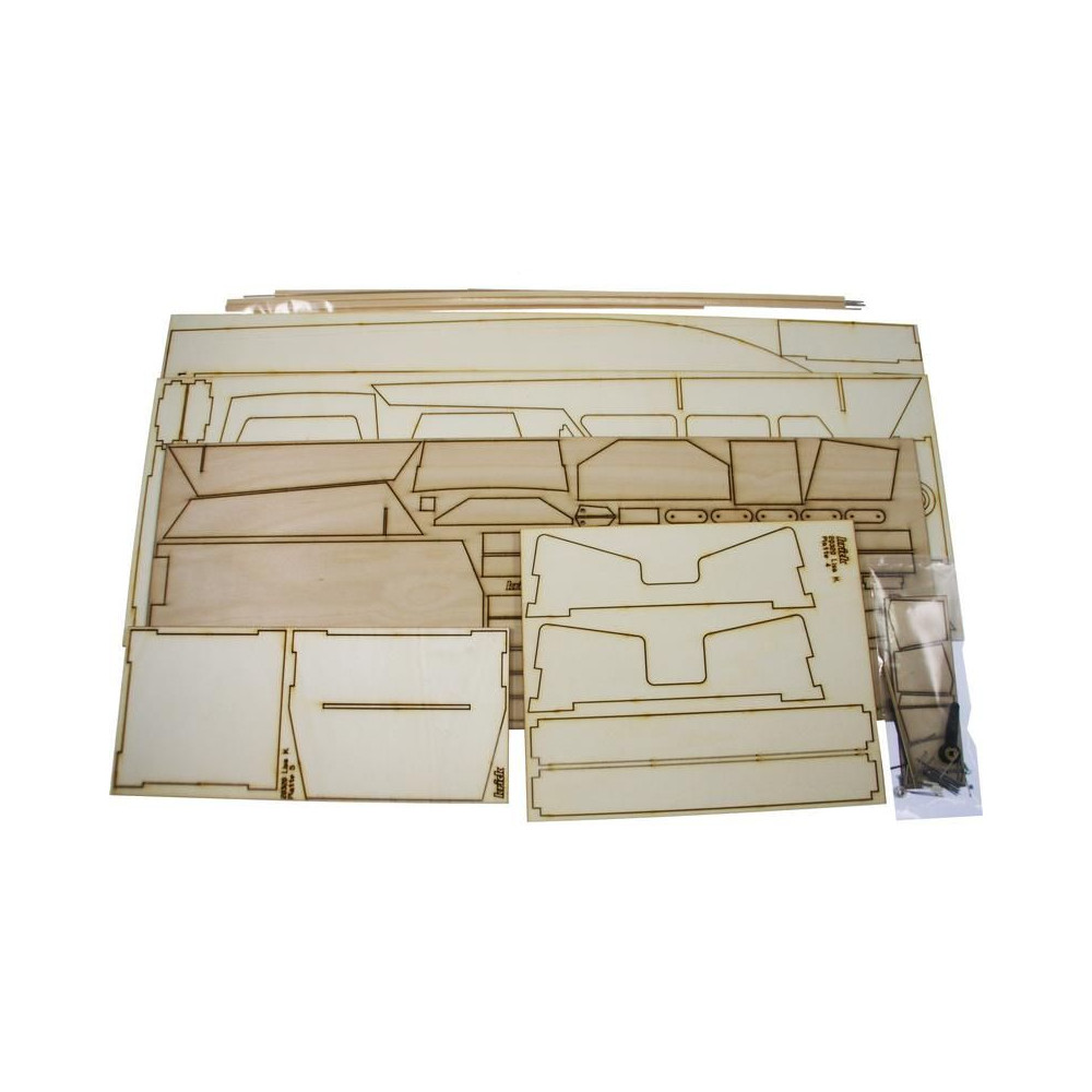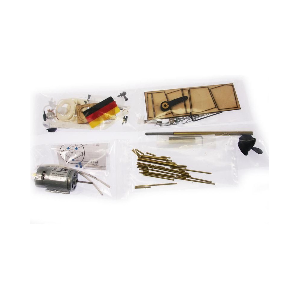 A doboz fedelét kinyitva a modell rétegelt lemezből készült fa alkatrészeit, egy sor öntvényt, zacskókba zárt kis alkatrészeket, egy rajzkészletet és egy kézikönyvet talál.