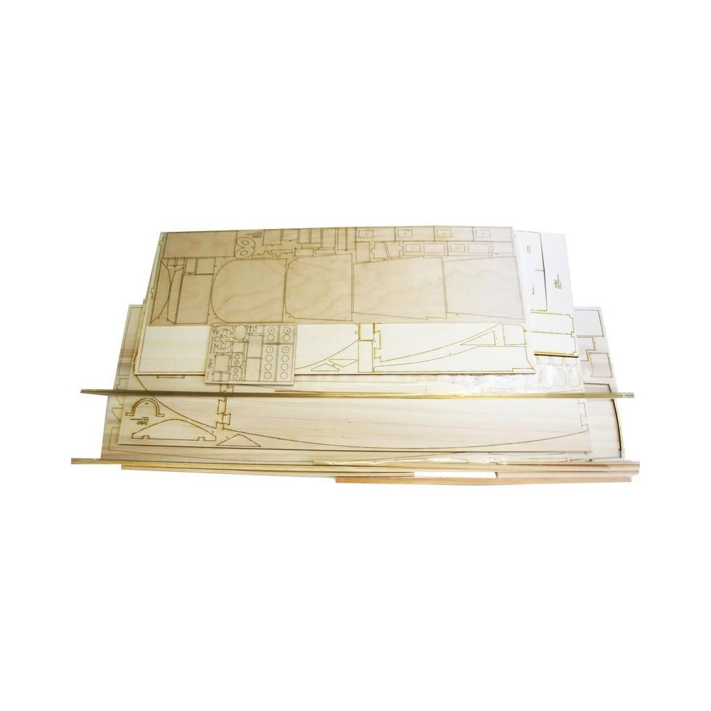 A doboz fedelét kinyitva a modell fából készült rétegelt lemez alkatrészeit, műanyag törzsrészeket, egy sor öntvényt, zacskókba zárt apró alkatrészeket, egy rajzcsomagot és egy kézikönyvet talál.