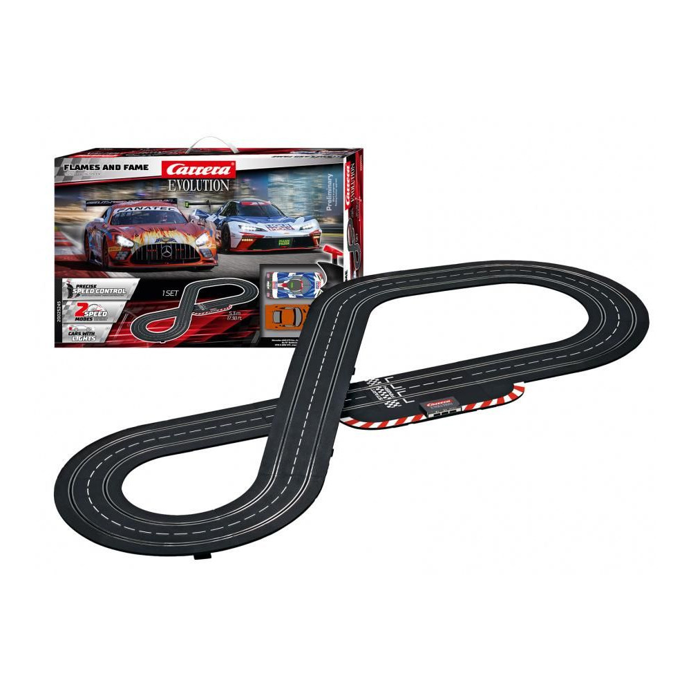 Az 5,3 méter hosszú Carrera EVOLUTION pálya Mercedes-AMG GT3 és KTM X-BOW GTX autókkal egyeneseket, hidakat, kanyarokat, sebességszabályozókat és egyéb részeket tartalmaz.