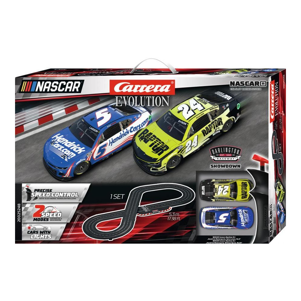 Az USA-ban a NASCAR versenyzés a legnépszerűbb motorsport. A Carrera EVOLUTION 'NASCAR' az amerikai motorteljesítményt hozza el a világ nappalijába. Az 5,3 méter hosszú versenypálya hosszú egyenesekkel és kanyarokkal rendelkezik, így ideális a nagy sebességű párbajokhoz. A Hendricks Motorsports versenycsapat két Chevrolet Camaro NextGen ZL1 autója áll rajthoz. Az 5-ös rajtszámú autót a 2021-es bajnokságban győztes kaliforniai Kyle Larson, míg a 24-es rajtszámú autót csapattársa, az észak-karolinai William Byron vezeti. A Living Room Cup bajnokság kimenetele végső soron kizárólag a Carrera versenyzőinek kezében lévő pilóták kezében van.