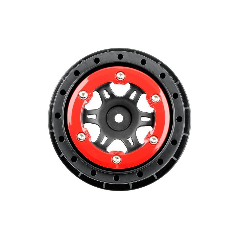 Korongok Split Six 2.2"/3.0" - elöl Short Course RC modellautókhoz 1:10. Szín fekete, piros gyűrű. A hordozó 12 mm-es hatszögletű.