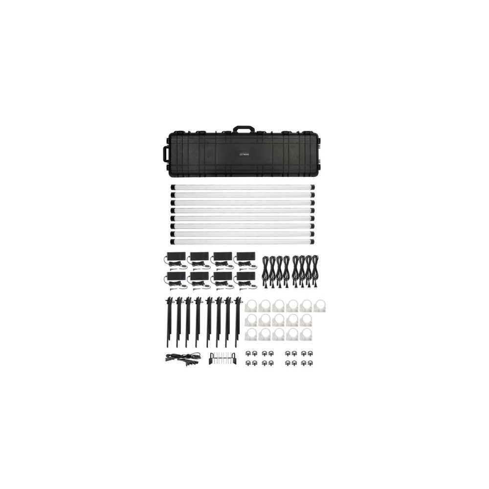 8x PavoTube II 30X LED fénycső.8x hálózati adapter 8x hálózati adapter gumipánt 1x 8in1 hálózati adapter tartó 8x 3M tápkábel 1x 1/8 DC tápkábel 8x padlóállvány 16x klipsz 16x szemcsavar 1x szállítási tok