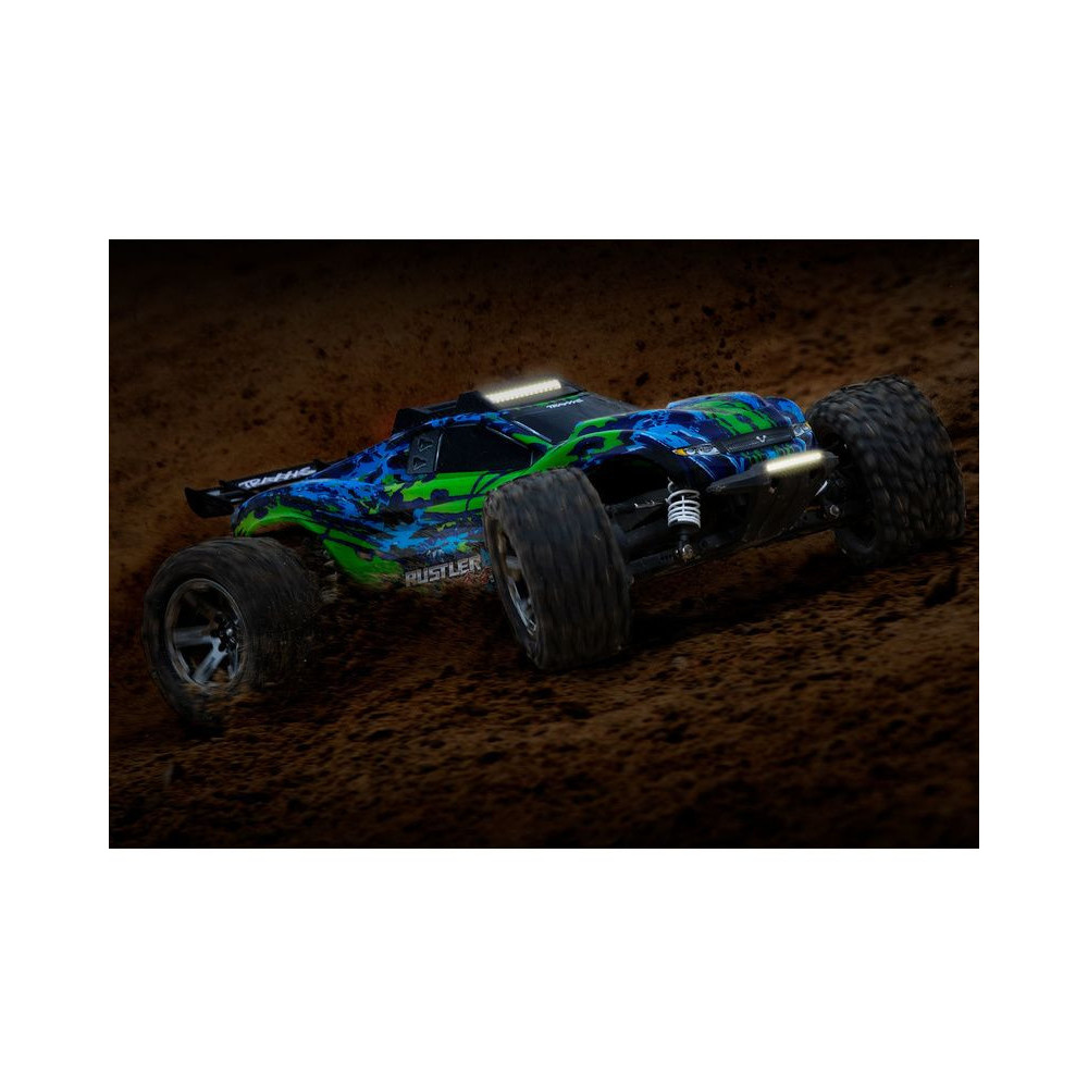 A szórakozás a Traxxas Rustler 4x4 RC modellautóval még naplemente után sem ér véget, köszönhetően az új, erőteljes LED-világításnak. Az eredeti készletet pontosan ehhez a modellhez tervezték. A nagy fényerejű LED-eket az új első lökhárítóba és a tető keretébe integrálták, amelyek a legkeményebb kompozit anyagból készültek. Két intenzív fehér fénysáv mutat előre, a hátsó piros fénysáv pedig hátrafelé világít. A világítást a mellékelt tápegység táplálja, hogy stabil megvilágítást biztosítson halványodás és villódzás nélkül.