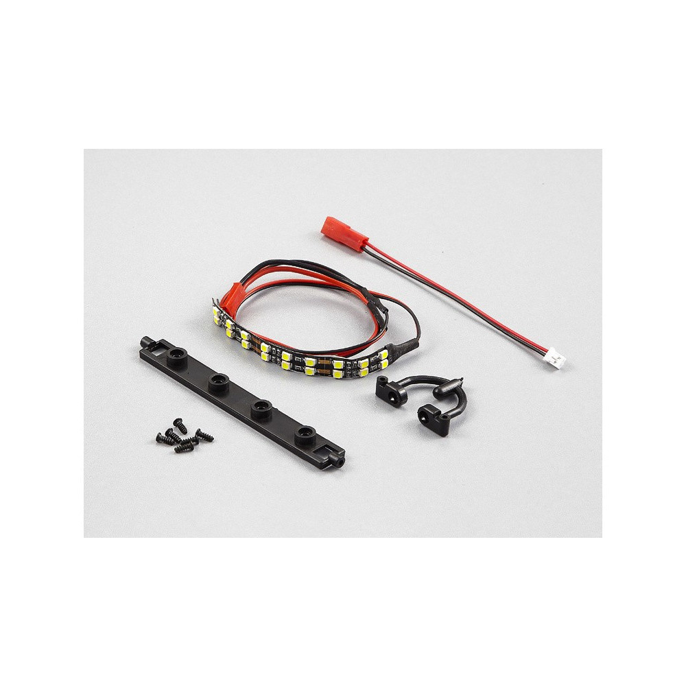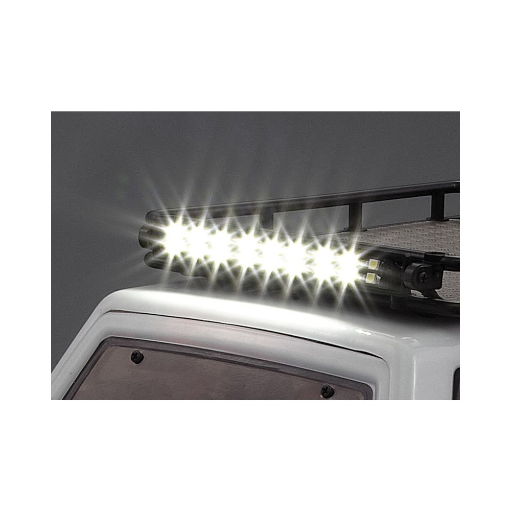 A csík hátsó ragasztóoldalának köszönhetően könnyen rögzíthető a fekete műanyag kerethez. Ezt a rögzítőkészlet segítségével a modellautó karosszériáján lévő tetőcsomagtartóra lehet felhelyezni. A LED-szalag 18 darab fehéren világító LED-et tartalmaz.