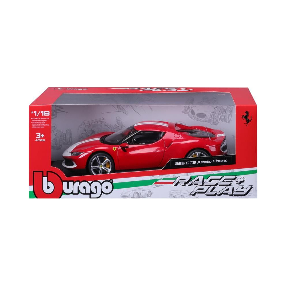 Fém autómodell 1:18 Bburago 18-16017RD Ferrari 296 GTB Assetto Fiorano, nem csak gyűjtőknek. A modell részletes kivitelben készült. A modell színe piros, és körülbelül 24 cm-es.