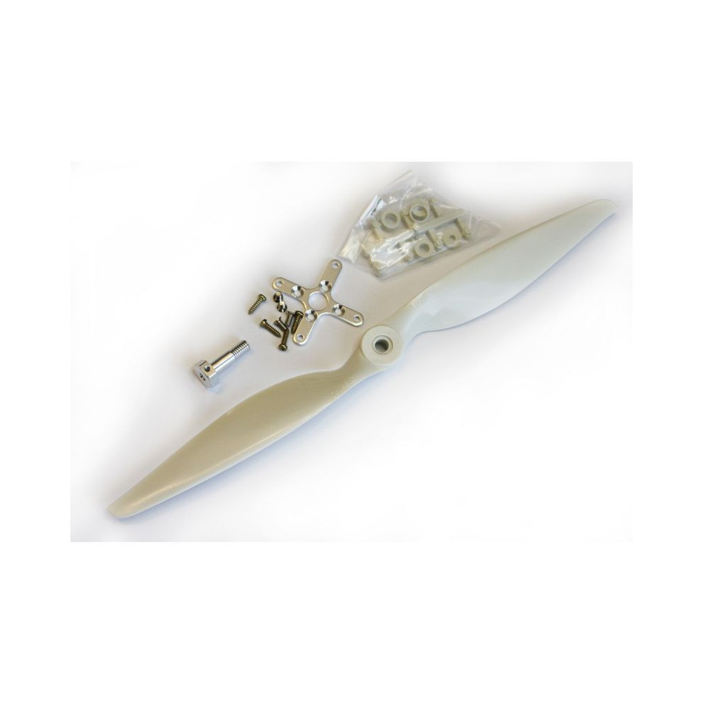 Propeller elektro fehér műanyag, méret 11x5.5 (279x140), furat 6mm, 3mm átmérőjű szűkítők mellékelve. Tartalmazott légcsavarhordozó 3,5mm-es tengelyen, M6-os menettel. Alumínium kereszt 2,5mm-es furatokkal, 28mm-es osztással.