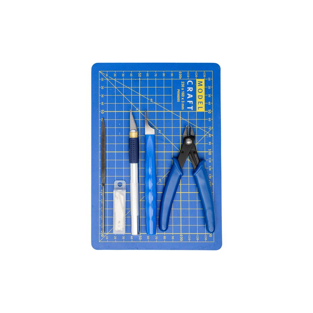 A Modelcraft szerszámok műanyag készletekhez (10 darabos készlet) nem csak műanyag készletek építéséhez használhatóak. Tartalmaz 230x160x3mm-es vágószőnyeget, modellező kést alumínium nyéllel és tartalék pengékkel, lapos reszelőt, éltelenítő szerszámot és hasító fogót.