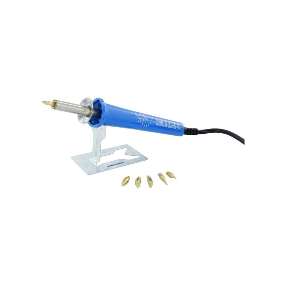 ST-30 pirográfiai forrasztópáka a minták puha fába, bőrbe és hasonló alkalmas anyagokba történő beégetéséhez. Tápellátás 230 V-ról, teljesítmény 30 W. 6 különböző formájú sárgaréz hegyet tartalmaz.