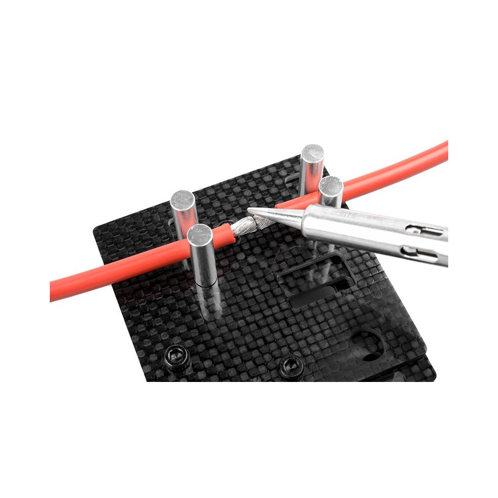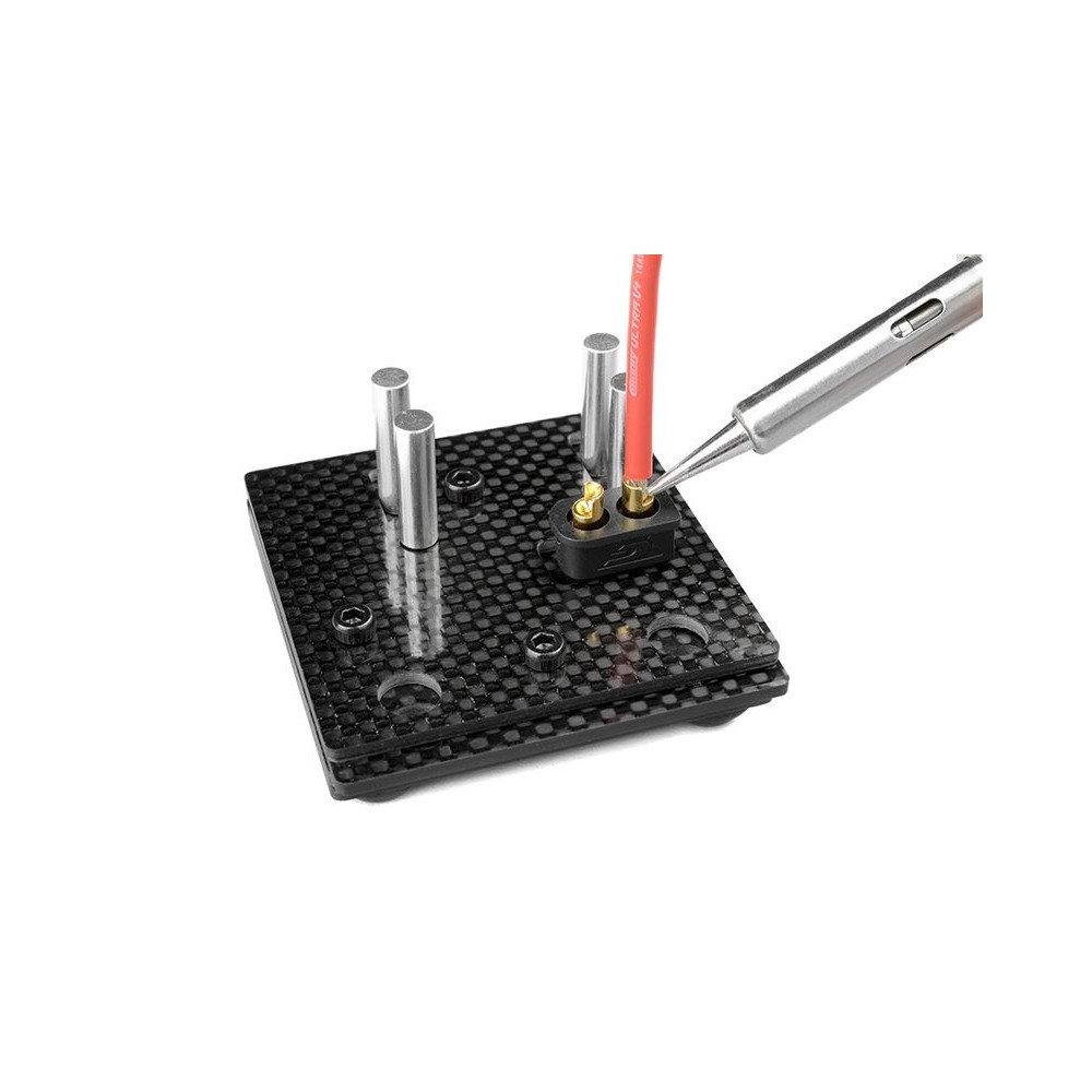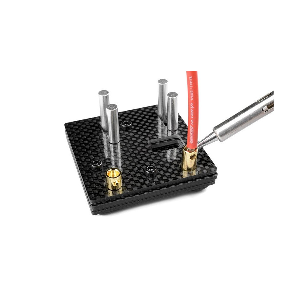 Team Corally univerzális jig a csatlakozók és kábelek kényelmes forrasztásához. Karbon kompozitból készült, és lehetővé teszi a csatlakozók széles választékának egyszerű rögzítését.
