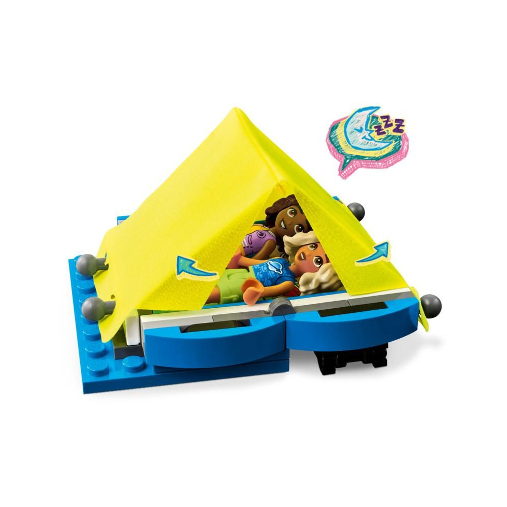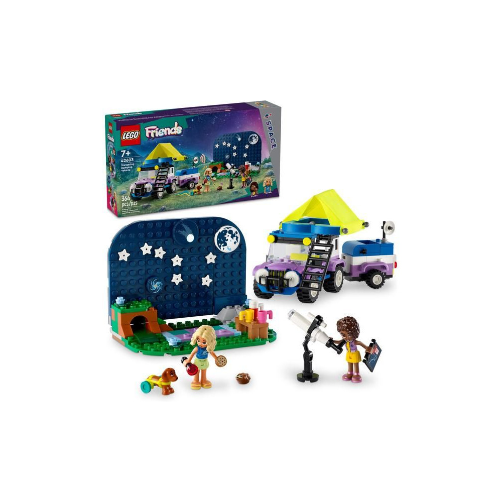 A LEGO® Friends Adventure Set (42603) Csillagleső lakókocsival a 7 éves és idősebb gyerekek felfedezőútra indulnak. A készlet tartalmaz egy megépíthető teleszkópot, 4x4-es járművet lakókocsival és önhajtogató sátorral, 2 mini serpenyőt, egy kutyafigurát és egy sündisznófigurát.