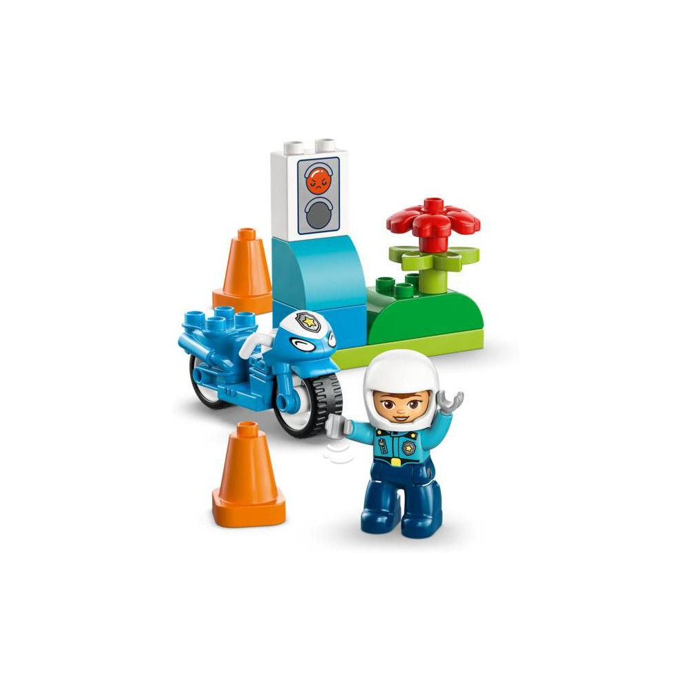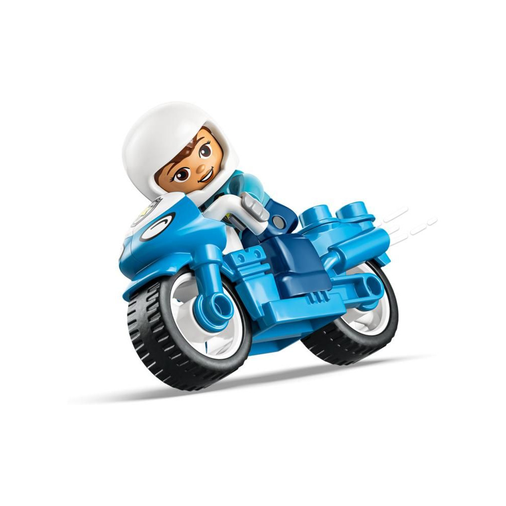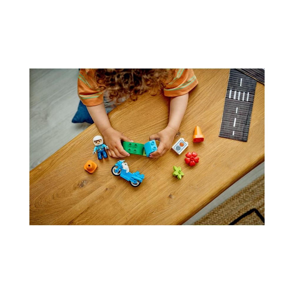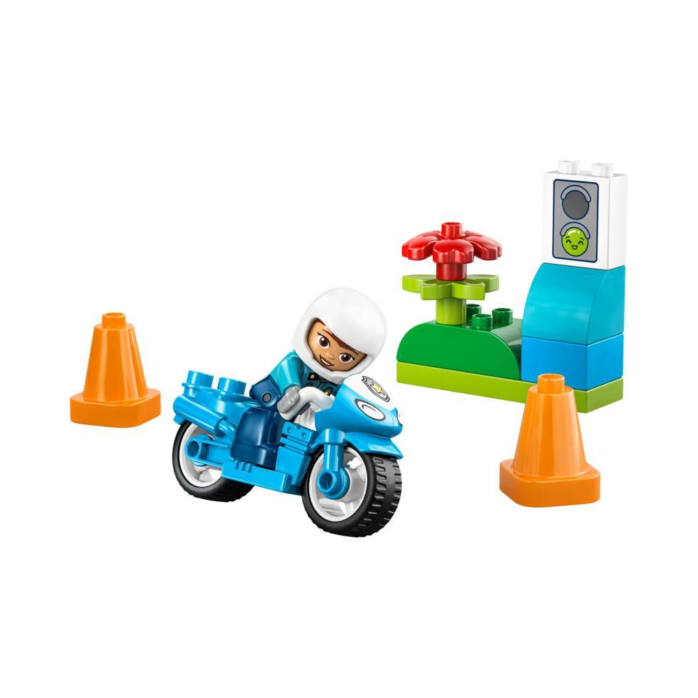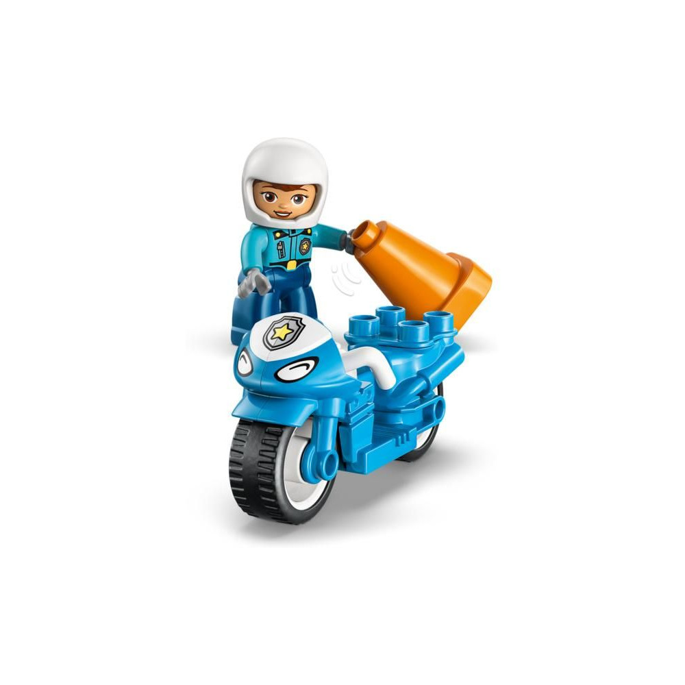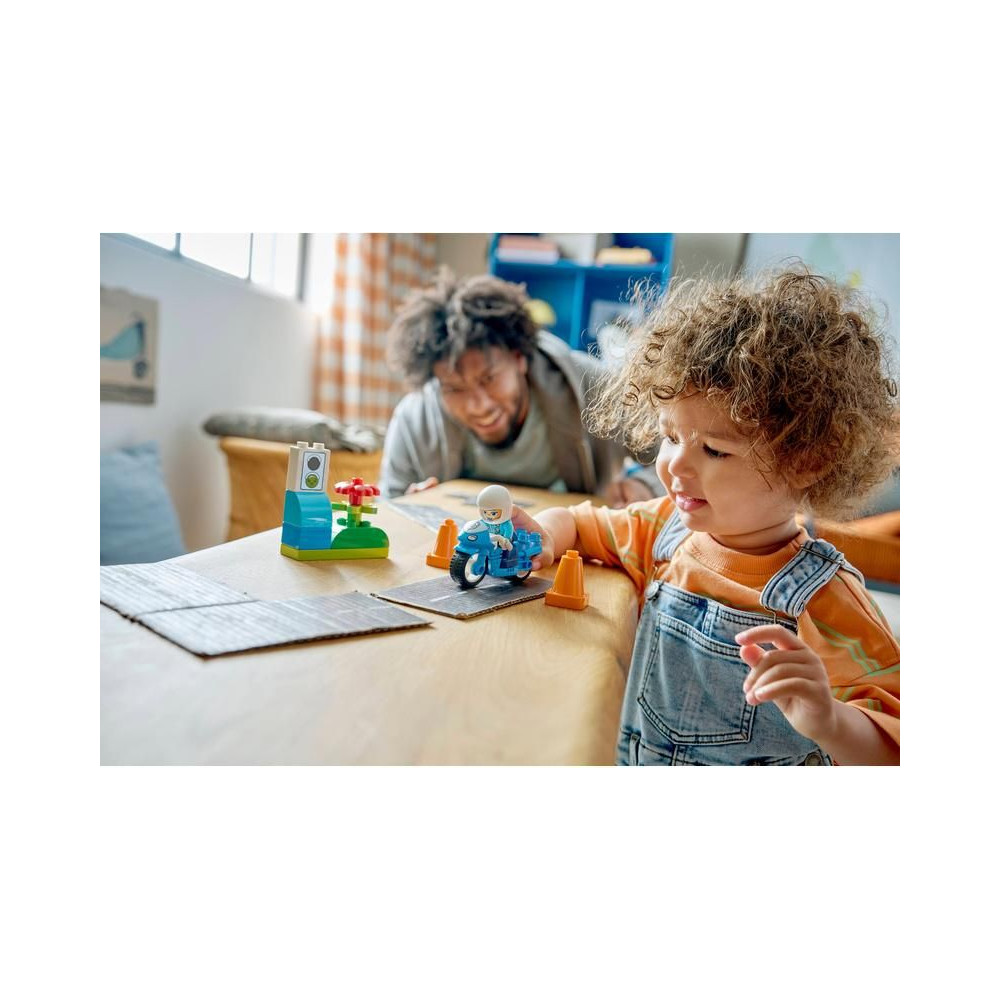 A gyerekek felültetik a LEGO DUPLO rendőrnőt egy motorra, és gyakorolják finommotoros készségeiket, miközben a bóják között vezetnek. Egy közlekedési lámpa formájú játékkal a szülők megtaníthatják a fiatal közlekedőknek, hogy a piros megállást, a zöld pedig indulást jelent! A készlet 11 alkatrészt tartalmaz.