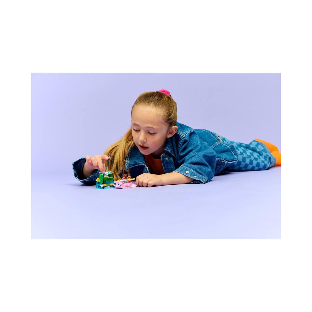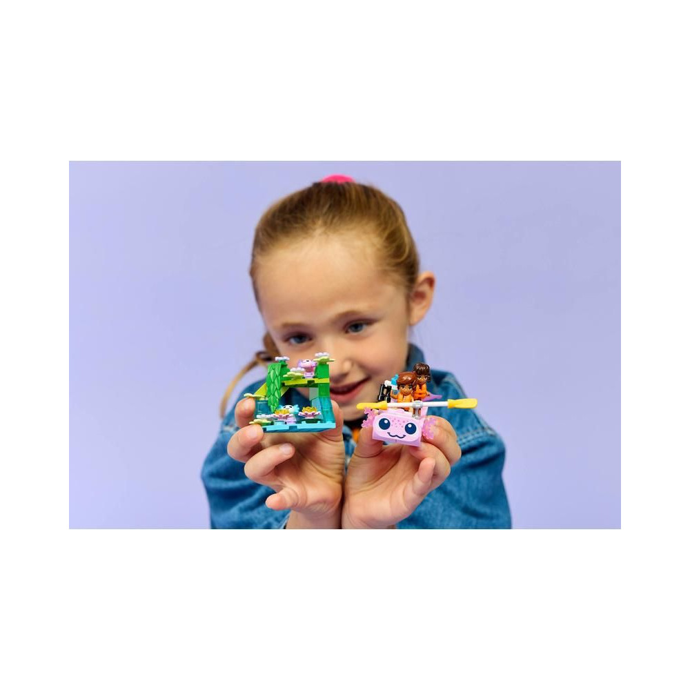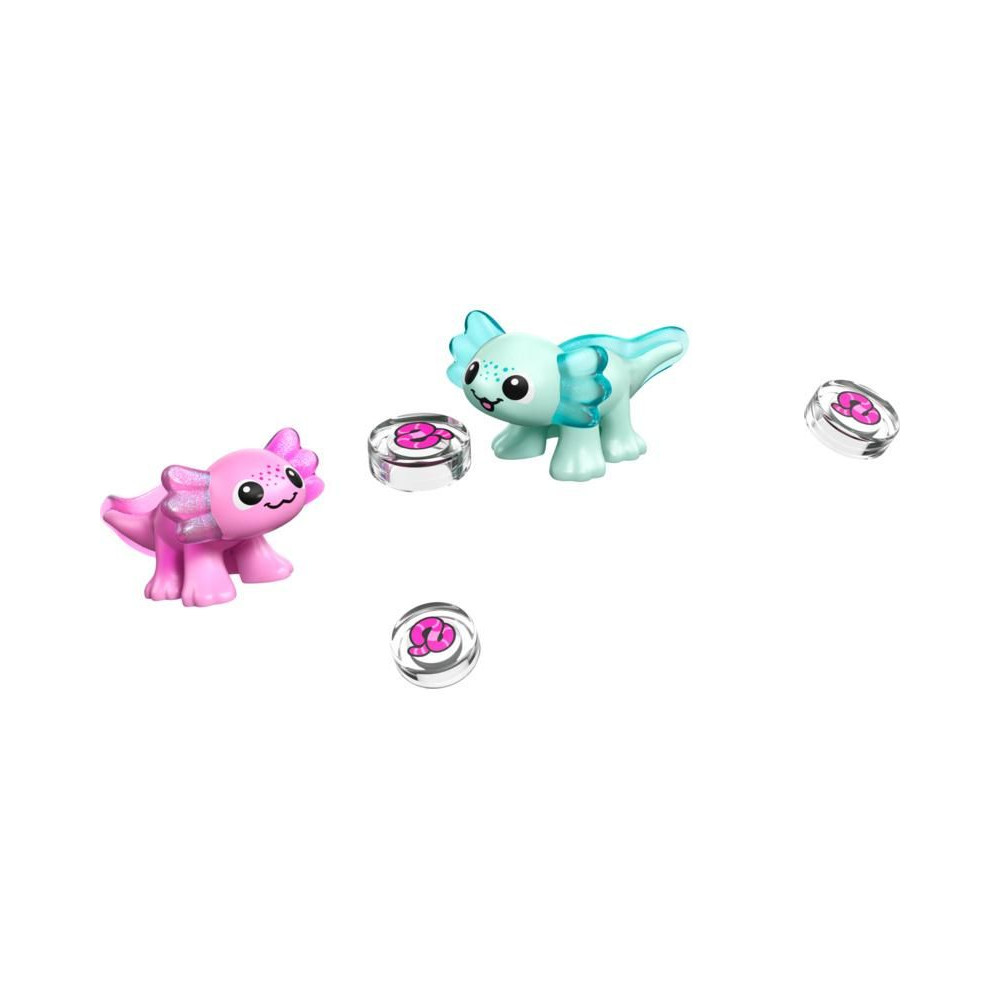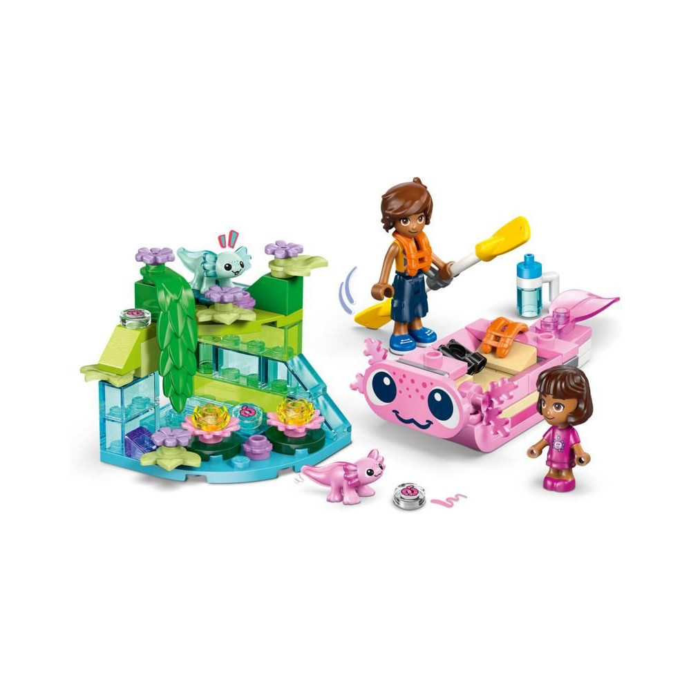 A gyerekek nagyon jól fogják szórakozni a csónakkal, amelyet egy mosolygós, barátságos axolotl arc és egy csóváló farok díszít. A figuráknak való ülések, evezők és 2 mentőmellény is megtalálhatók a csomagban. A csatlakoztatható kisebb modell növényekkel, virágokkal és vízkockákkal van díszítve, hogy a gyerekek természetes környezetet teremthessenek az axolotloknak.