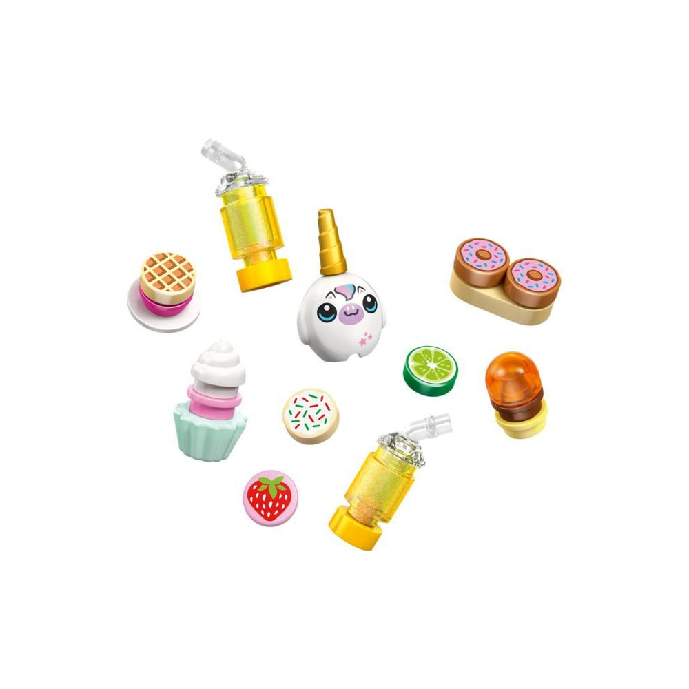 - Kidolgozott KÁVÉZÓ KIEGÉSZÍTŐK – Dobd fel a játékot fánkok, gofrik, sütik, cupcake-ek, torták, gyümölcslé- és turmixbár, ülőhelyek, pénztárgép és egy plüss LEGO® unikornis formájában.