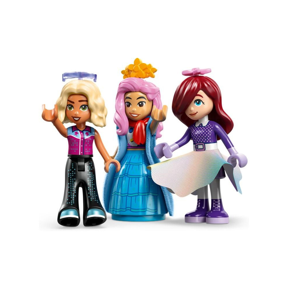 - 3 LEGO® FRIENDS SZEREPLŐ – Ez a divatos játék 3 minibabát tartalmaz – Paisley-t, Liann-t és Novát –, akiket felöltöztethetsz az öltözőasztalnál, majd elhelyezheted őket egy forgó platformon, ahol megmutathatják ruháikat más szereplőknek.