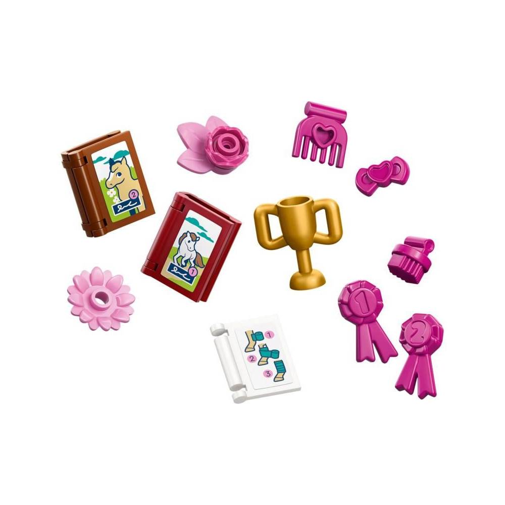 A készlet rengeteg kiegészítőt tartalmaz, így a gyerekek minden nap új játékkalandra indulhatnak. A készlet tartalmaz egy lótakarót, akadályokat, egy kereket, széna- és sárgarépadobozokat, egy táblát, trófeákat, könyveket, ágyakat és egyéb kiegészítőket.
