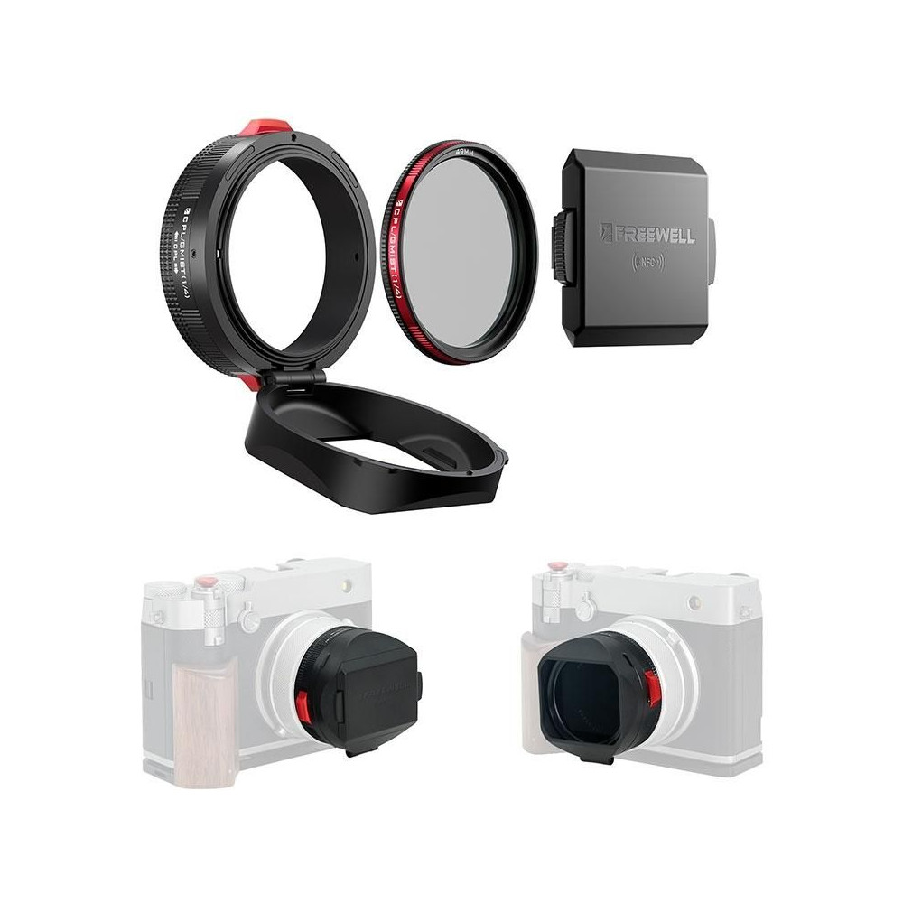 A Fujifilm GFX100RF Freewell Real objektívellenzője új szintet kínál az objektívvezérlés és -védelem terén. Masszív CNC-alumínium vázzal rendelkezik, amely növeli a tartósságot felesleges súlynövekedés nélkül. Tartalmaz egy hibrid 49 mm-es CPL + Black Mist 1/4" szűrőt , amely fokozza a kontrasztot, elnyomja a tükröződéseket és filmes érzetet kölcsönöz a képeknek.