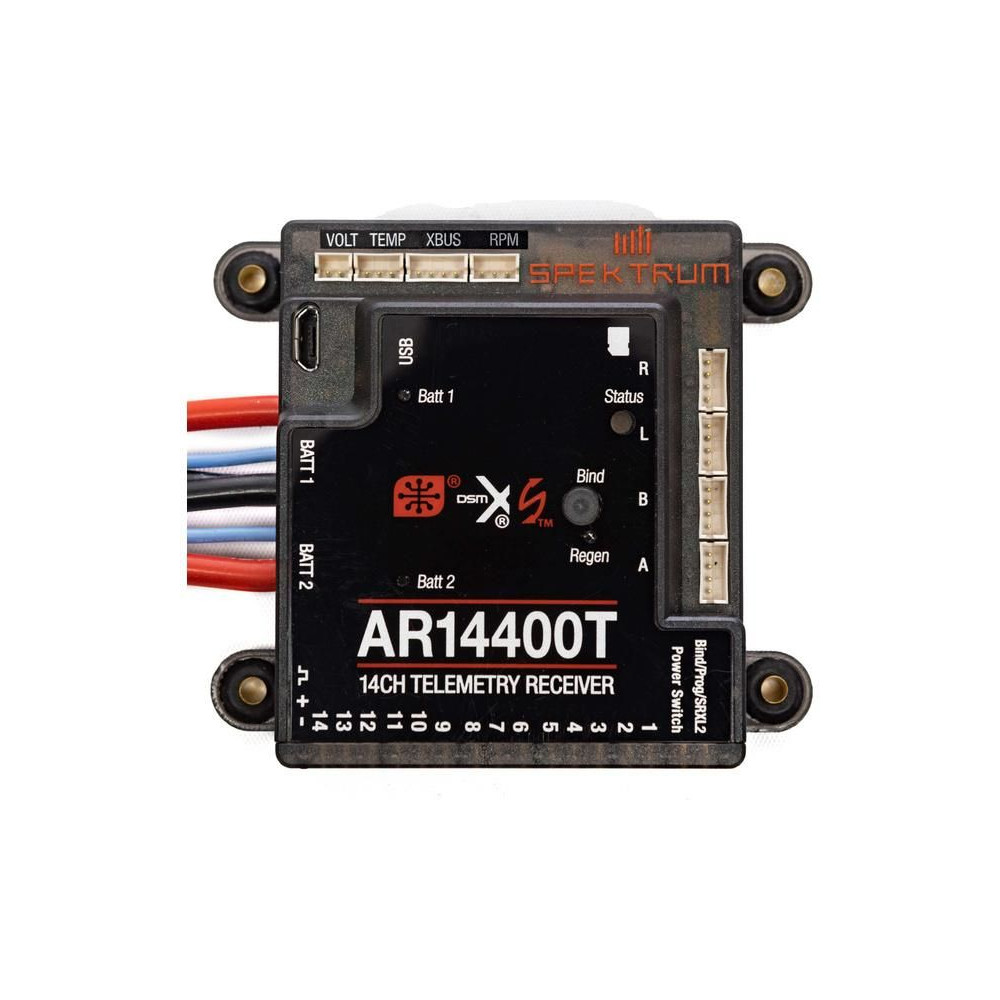 AR14400T vevő 14 csatornával és telemetriával (SRXL2). Redundáns tápellátás két elemmel (IC3). Nagyobb, akár 35A-ig terjedő áramterhelésű, több kiszolgálóból álló modellekhez tervezték. Micro USB csatlakozó, SD kártyahely az adatnaplózáshoz. Bartometrikus érzékelő.