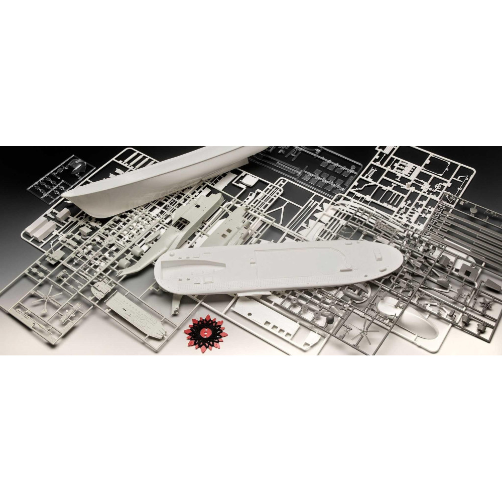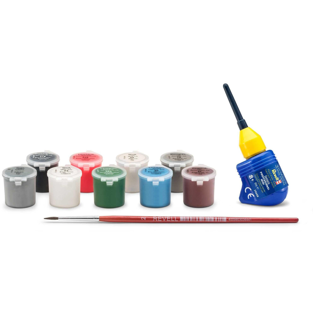 2 műanyag modell (összeszereletlenül), összeszerelési útmutató, matricák, festék (Revell Aqua Color), ecsetek, ragasztó (Revell Contacta Professional Mini), madzag, poszter.