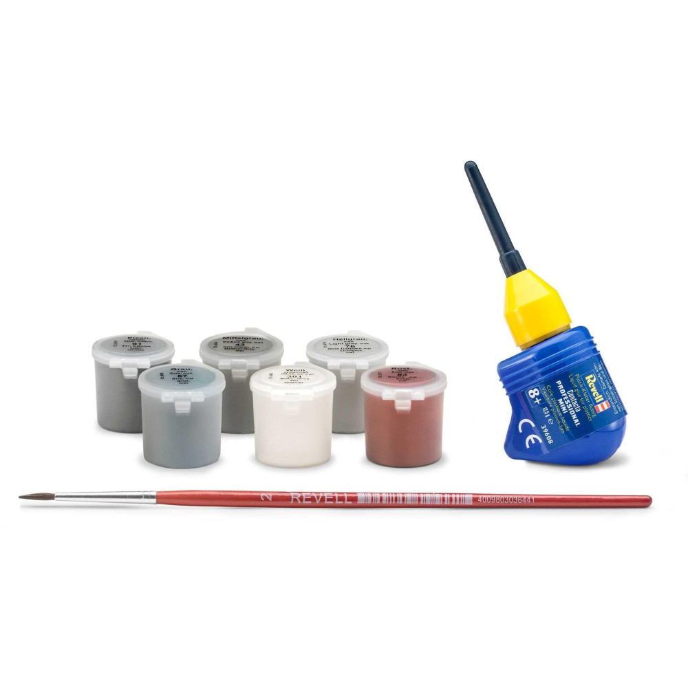 2 műanyag modell (összeszereletlenül), illusztrált többnyelvű összeszerelési útmutató, matricák, festék (Revell Aqua Color), ecsetek, ragasztó (Revell Contacta Professional Mini).