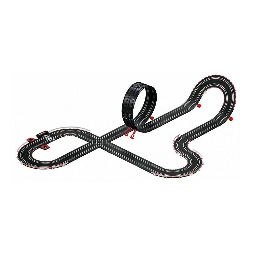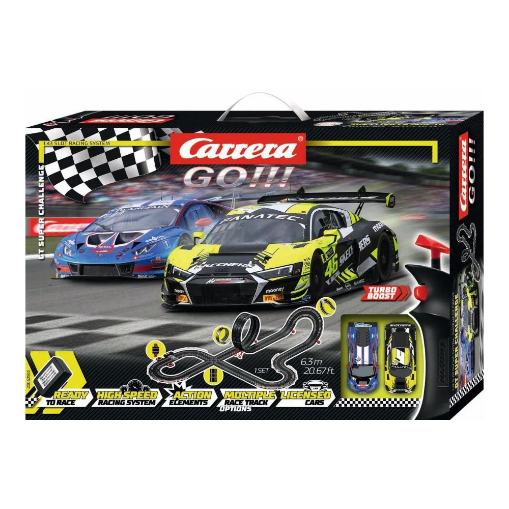 Carrera GO!!! 6,3m hosszú Audi R8 LMS GT3 és Lamborghini Huracán GT3, tartalmazza a looping, kereszteződés, egyenesek, kanyarok, merőleges fal, kerékszámláló és egyéb részek. Más különböző pályákat is építhetsz a fantáziád szerint.