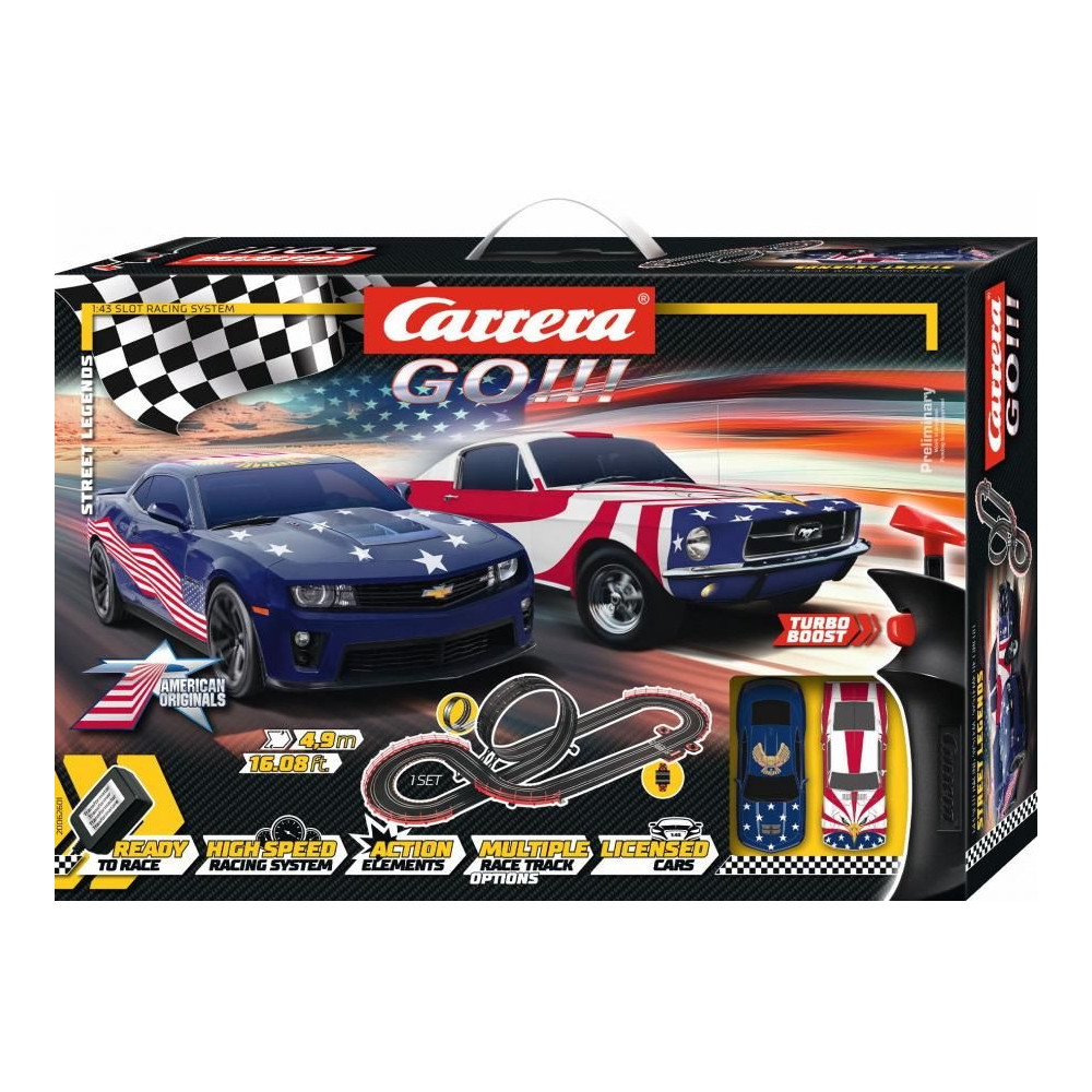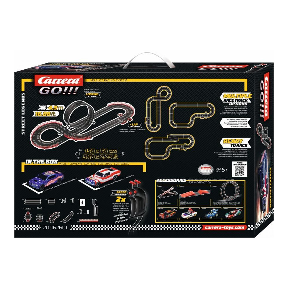 Carrera GO!!! 4,9 m hosszú pálya Ford Mustang ´67 és Chevrolet Camaro autókkal, tartalmaz hidat, egyeneseket, kanyarokat, hurkokat, körszámláló részt és egyéb alkatrészeket. Különböző pályákat építhetsz a fantáziád szerint. Pálya hossza: 4,9 m Méretek összeszerelés után: 158 x 68 cm A csomag tartalma: 1x Ford Mustang ´67 Stars ´n Stripes autó 1x Chevrolet Camaro Stars ´n Stripes autó egyenesek, hurkok, kanyarok 1x tápegység (61666) 1x körszámláló rész (88107) 2x sebességszabályozó (61663) 1x transzformátor tartók, lökhárítók, érintkezőkefék, vezetősínek, használati utasítás GO!!! - Turbó sebesség az autóversenyzés világában Carrera 1:43 méretarányú pálya 1:43 méretarányú autó Minden készlet tartalmaz egy Turbó funkcióval ellátott sebességszabályozót Minden autó dupla érintkezőkefével rendelkezik a jobb pályatapadás érdekében Minden autó mágneses szorítórendszerrel rendelkezik, amely megkönnyíti a pálya összeszerelését és szétszerelését Precíz és stabil pályaszerkezet, beleértve a magasságban állítható tartókat Részletes, tamponnyomással ellátott autók Kizárólagos világszintű licenc az F1 Ferrarihoz, a Red Bull eredeti licencéhez Mancs őrjárat, Minionok, Disney-Pixar Verdák, Star Wars, Nintendo, Sonic Széles kiegészítőválaszték (híd, körszámláló, ugródeszka, körforgalom, bővítőkészletek, rally alkatrészek és egyebek) Még több versenyzési élményért Nagyon kiváló minőségű kidolgozás A készletek tartalmaznak tápegységet, mechanikus körszámlálót, 2x sebességszabályozót, 2x autót, lökhárítókat, pályacsatlakozókat, használati utasítást 6 éves kortól alkalmas Gyermekeknek Minden készlet tartalmaz tartalék érintkezőkeféket az autó analóg rendszeréhez A CARRERA spanyolul versenyt jelent, és egy dolgot garantálhatunk. Amint kinyitod a Carrera logós dobozt, a versenyzői véred teljes sebességgel fog pumpálni, függetlenül attól, hogy melyik pályán vagy autón versenyzel. Ezt az érzést már megtapasztalhattad több ezer rajongó 1963 óta, amikor a Carrera márka megnyitotta első versenypályáját. Az elkövetkező több mint negyven évben a Carrera vezetővé fejlődött a versenyzés, az autók és a kiegészítők területén. Ma kiváló minőségű termékeket kínál, amelyeket nemcsak gyermekek, hanem felnőttek számára is terveztek, akik számára az autóversenyzés élethosszig tartó hobbivá vált.