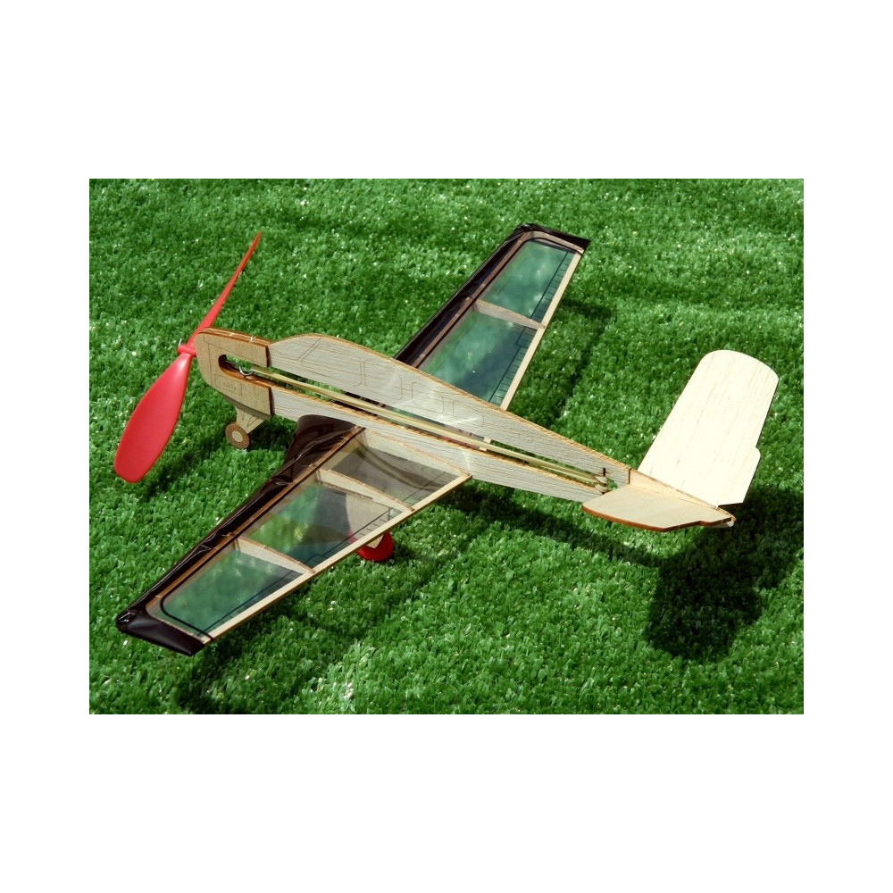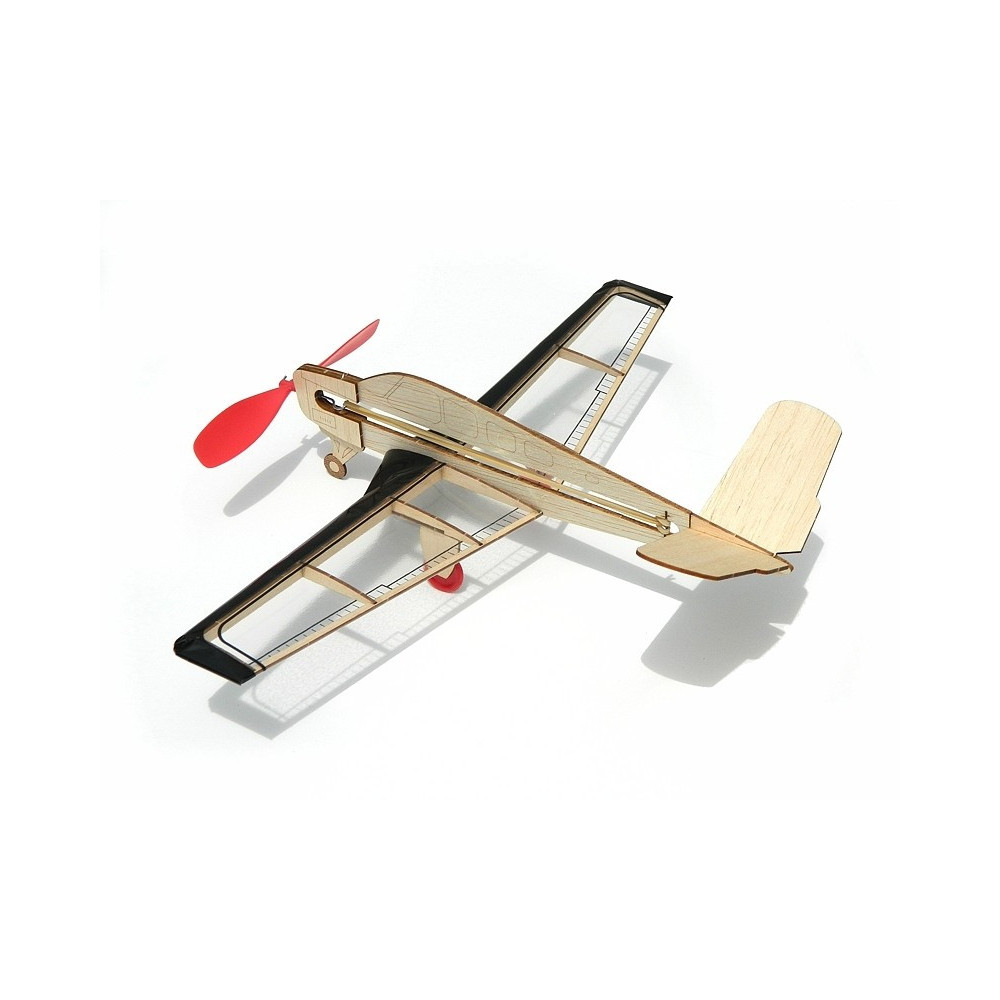 Ez a kis 318 mm szárny fesztávolságú gumimotoros ideális választás mindenki számára, aki meg akar ismerkedni a repülőmodell építésének hagyományos módjával. A teljesen fából készült vázat lézerrel pontosan kivágott balsafa alkatrészekből tudjuk összeállítani. A ragasztáshoz használhatunk modern diszperziós vagy a régi idők acetonos ragasztóját.