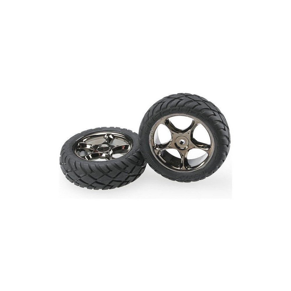 Teljes első kerekek a Traxxas Bandithoz. Fekete krómozott kerekek Anaconda gumiabroncsokkal. Kerékméret ø60x25 mm, teljes méret 83x29 mm. A hordozó tengely egy csapszeggel ellátott tengely. Offset 15 mm.